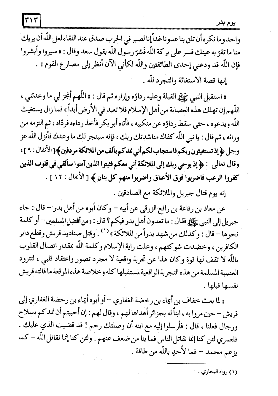"استقبل النبي - صَلَّى اللَّهُ عَلَيْهِ وَسَلَّمَ - القبلة وعليه رداؤه وإزاره ثم قال: "اللهم أنجز لي ما وعدتني، اللهم إن تهلك هذه العصابة من أهل الإسلام فلا تعبد في الأرض أبداً" فما زال يستغيث الله ويدعوه، حتى سقط رداؤه عن منكبيه، فأتاه أبو بكر فأخذ رداءه فردّاه، ثم التزمه من ورائه، ثم قال: يا نبي الله كفاك مناشدتك ربك، فإنه سينجز لك ما وعدك فأنزل الله عز وجل (إذ تستغيثون ربكم فاستجاب لكم أني ممدكم بألف من الملائكة مردفين) [الأنفال: 9] ، وقال تعالى: (إذ يوحي ربك إلى الملائكة أني معكم فثبتوا الذين آمنوا سألقي في قلوب الذين كفروا الرعب فاضربوا فوق الأعناق واضربوا منهم كل بنان) [الأنفال: 12] .