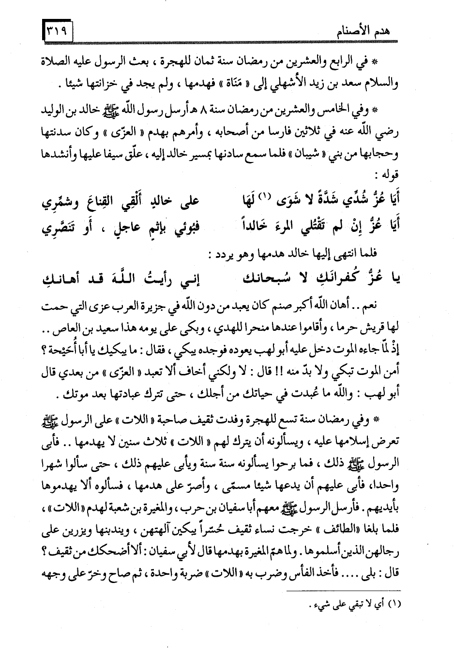 * وفي الخامس والعشرين من رمضان سنة 8 هـ أرسل رسول الله - صَلَّى اللَّهُ عَلَيْهِ وَسَلَّمَ - خالد بن الوليد رضي الله عنه في ثلاثين فارسا من أصحابه، وأمرهم بهدم "العزّى" وكان سدنتها وحجابها من بني "شيبان" فلما سمع سادنها بمسير خالد إليه، علّق سيفا عليها وأنشدها قوله:
