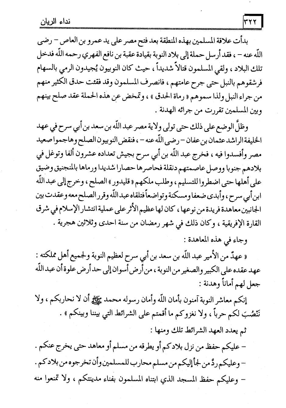 إنكم معاشر النوبة آمنون بأمان الله وأمان رسوله محمد - صَلَّى اللَّهُ عَلَيْهِ وَسَلَّمَ - أن لا نحاربكم، ولا نَنْصُبَ لكم حرباً، ولا نغزوكم ما أقمتم على الشرائط التي بيننا وبينكم".
