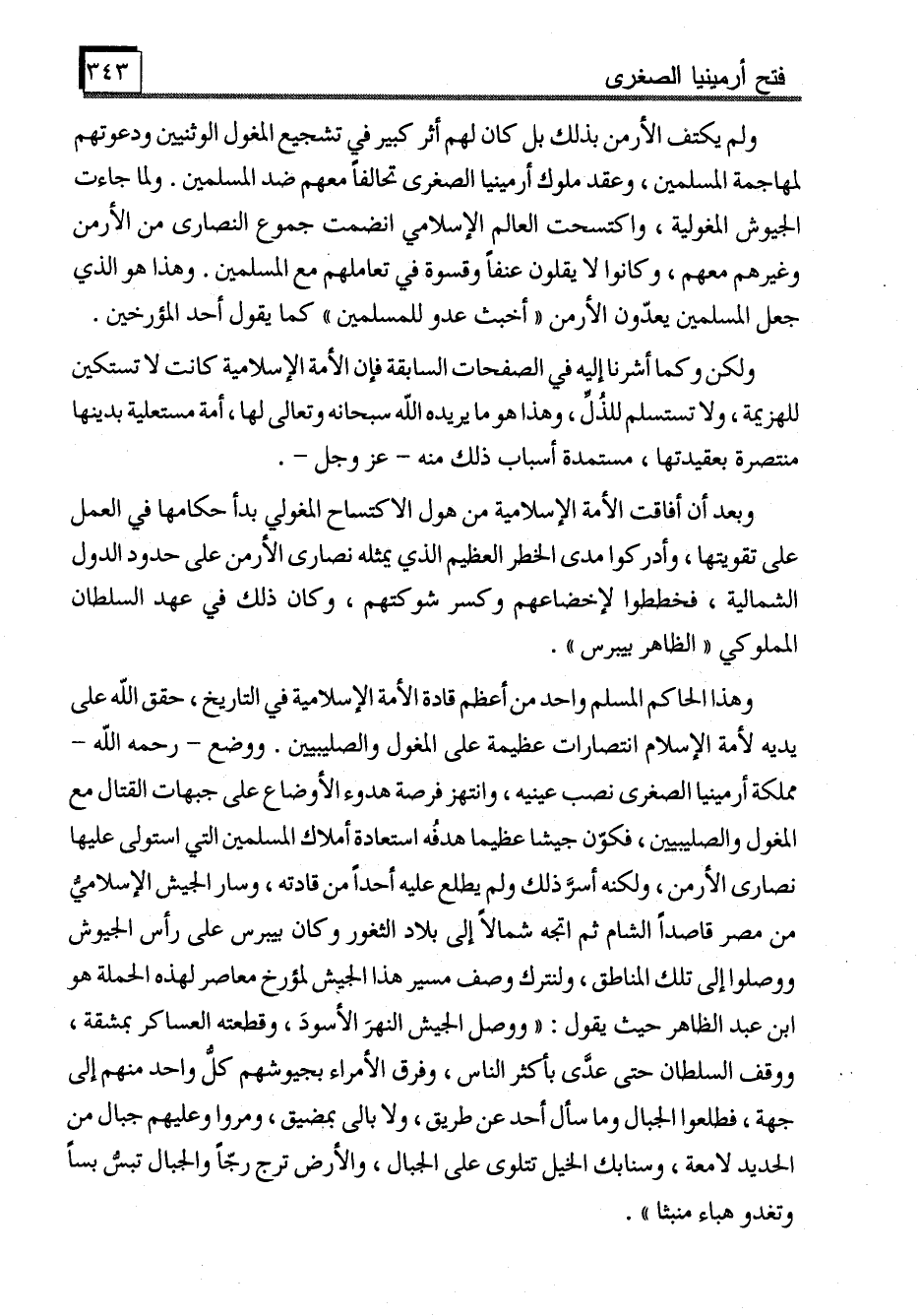 وهذا الحاكم المسلم واحد من أعظم قادة الأمة الإسلامية في التاريخ، حقق الله على يديه لأمة الإسلام انتصارات عظيمة على المغول والصليبيين. ووضع -رحمه الله- مملكة أرمينيا الصغرى نصب عينيه، وانتهز فرصة هدوء الأوضاع على جبهات القتال مع المغول والصليبيين، فكوّن جيشا عظيما هدفُه استعادة أملاك المسلمين التي استولى عليها نصارى الأرمن، ولكنه أسرََّ ذلك ولم يطلع عليه أحداً من قادته، وسار الجيش الإسلامي من مصر قاصداً الشام ثم اتجه شمالاً إلى بلاد الثغور وكان بيبرس على رأس الجيوش ووصلوا إلى تلك المناطق، ولنترك وصف مسير هذا الجيش لمؤرخ معاصر لهذه الحملة هو ابن عبد الظاهر حيث يقول: "ووصل الجيش النهرَ الأسودَ، وقطعته العساكر بمشقة، ووقف السلطان حتى عدَّى بأكثر الناس، وفرق الأمراء بجيوشهم كل واحد منهم إلى جهة، فطلعوا الجبال وما سأل أحد عن طريق، ولا بالى بمضيق، ومروا وعليهم جبال من الحديد لامعة، وسنابك الخيل تتلوى على الجبال، والأرض ترج رجّاً والجبال تبسُّ بساً وتغدو هباء منبثا".