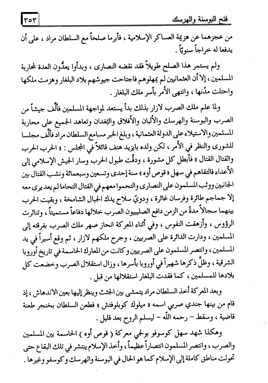 وهكذا شهد سهل كوسوفو بولجي معركة (قوص أوه) الحاسمة بين المسلمين والصرب، وانتصر المسلمون انتصاراً عظيماً، وأخذ الإسلام ينتشر في تلك البقاع حتى تحولت مناطق كاملة إلى الإسلام كما هو الحال في البوسنة والهرسك وكوسفو وغيرها.