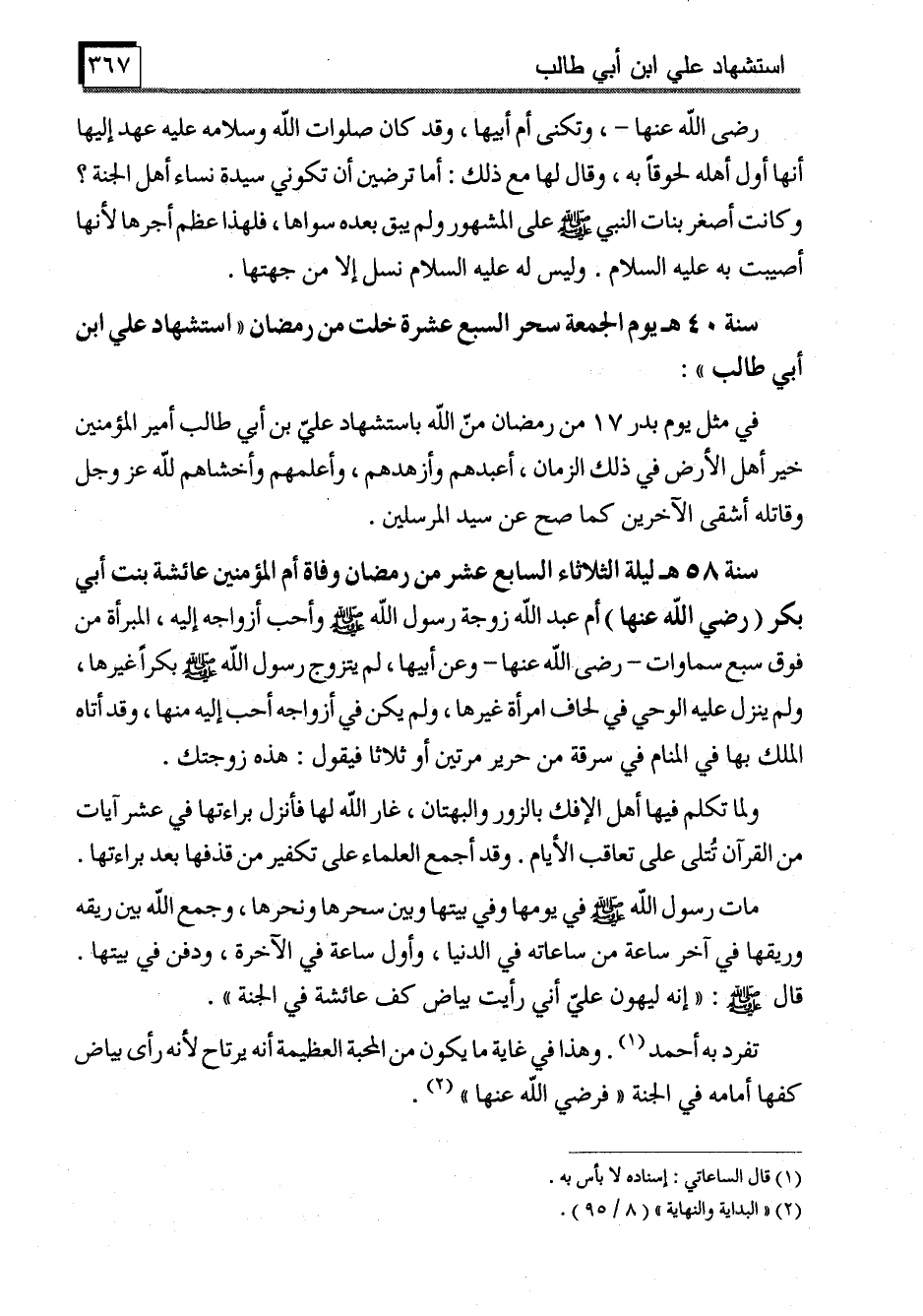 سنة 58 هـ ليلة الثلاثاء السابع عشر من رمضان وفاة أم المؤمنين عائشة بنت أبي بكر (رضي الله عنها) أم عبد الله زوجة رسول الله - صَلَّى اللَّهُ عَلَيْهِ وَسَلَّمَ - وأحب أزواجه إليه، المبرأة من فوق سبع سماوات -رضى الله عنها- وعن أبيها، لم يتزوج رسول الله - صَلَّى اللَّهُ عَلَيْهِ وَسَلَّمَ - بكراً غيرها، ولم ينزل عليه الوحي في لحاف امرأة غيرها، ولم يكن في أزواجه أحب إليه منها، وقد أتاه الملك بها في المنام في سرقة من حرير مرتين أو ثلاثا فيقول: هذه زوجتك.