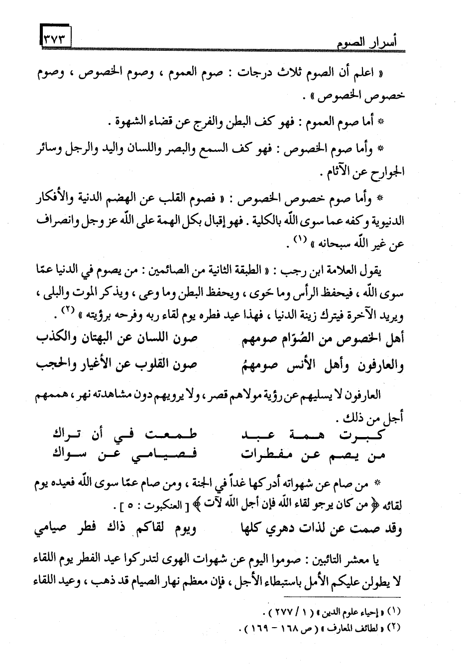 "اعلم أن الصوم ثلاث درجات: صوم العموم، وصوم الخصوص، وصوم خصوص الخصوص".