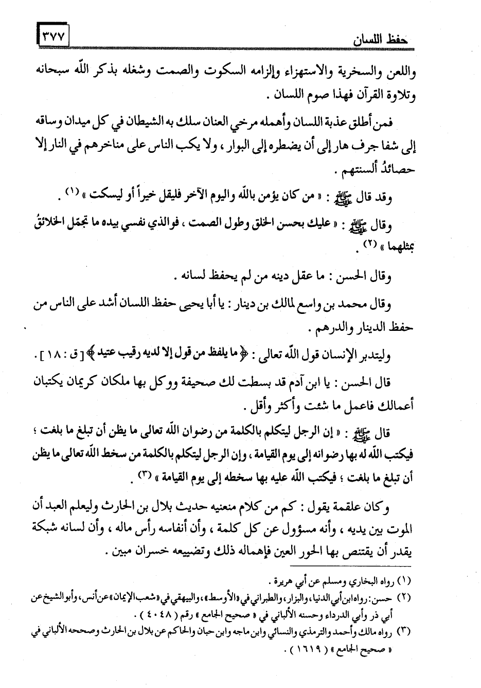 وكان علقمة يقول: كم من كلام منعنيه حديث بلال بن الحارث وليعلم العبد أن الموت بين يديه، وأنه مسؤول عن كل كلمة، وأن أنفاسه رأس ماله، وأن لسانه شبكة يقدر أن يقتنص بها الحور العين فإهماله ذلك وتضييعه خسران مبين.