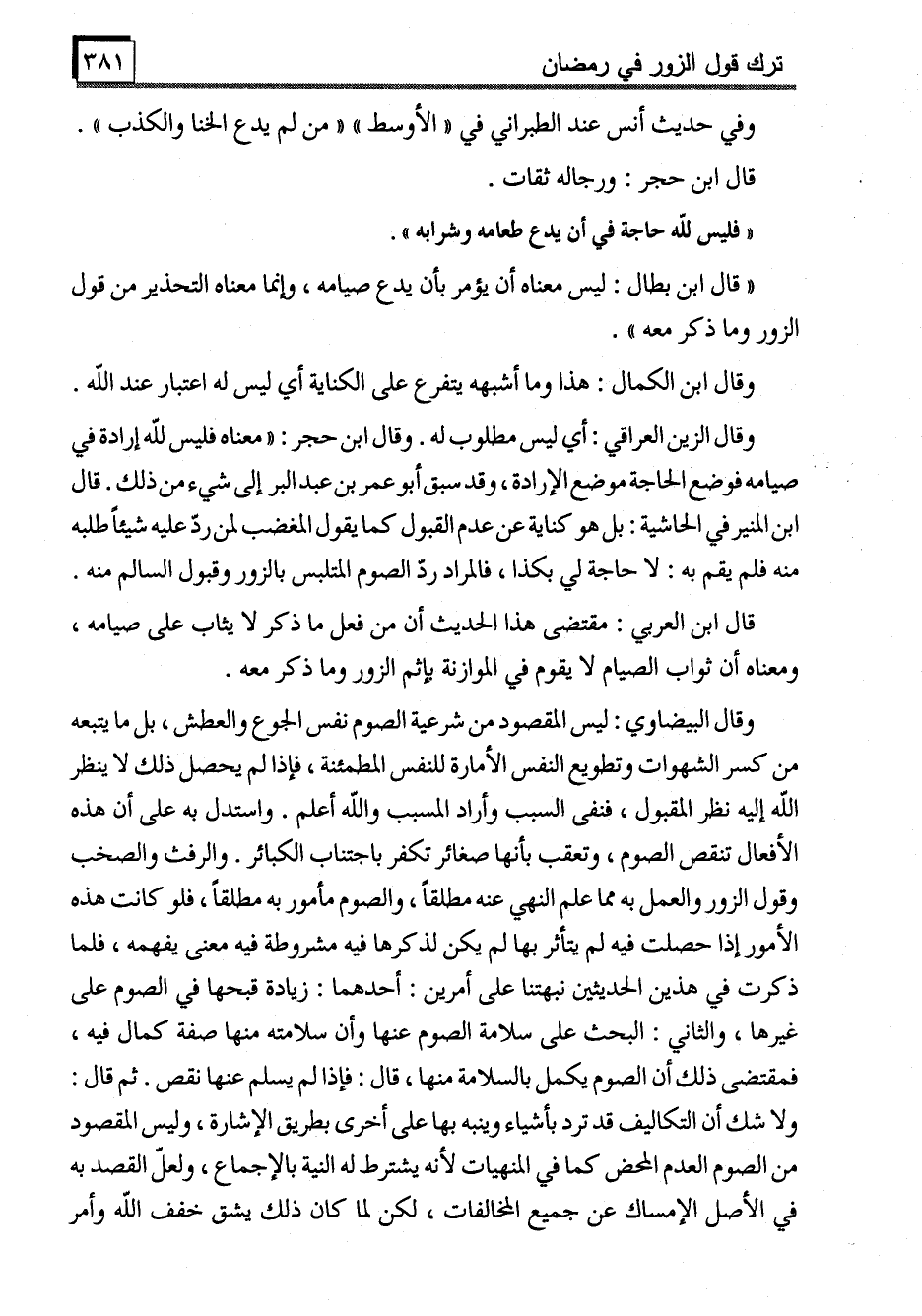 وقال البيضاوي: ليس المقصود من شرعية الصوم نفس الجوع والعطش، بل ما يتبعه من كسر الشهوات وتطويع النفس الأمارة للنفس المطمئنة، فإذا لم يحصل ذلك لا ينظر الله إليه نظر المقبول، فنفى السبب وأراد المسبب والله أعلم. واستدل به على أن هذه الأفعال تنقص الصوم، وتعقب بأنها صغائر تكفر باجتناب الكبائر. والرفث والصخب وقول الزور والعمل به مما علم النهي عنه مطلقاً، والصوم مأمور به مطلقاً، فلو كانت هذه الأمور إذا حصلت فيه لم يتأثر بها لم يكن لذكرها فيه مشروطة فيه معنى يفهمه، فلما ذكرت في هذين الحديثين نبهتنا على أمرين: أحدهما: زيادة قبحها في الصوم على غيرها، والثاني: البحث على سلامة الصوم عنها وأن سلامته منها صفة كمال فيه، فمقتضى ذلك أن الصوم يكمل بالسلامة منها، قال: فإذا لم يسلم عنها نقص. ثم قال: ولا شك أن التكاليف قد ترد بأشياء وينبه بها على أخرى بطريق الإشارة، وليس المقصود من الصوم العدم المحض كما في المنهيات لأنه يشترط له النية بالإجماع، ولعلّ القصد به في الأصل الإمساك عن جميع المخالفات، لكن لما كان ذلك يشق خفف الله وأمر