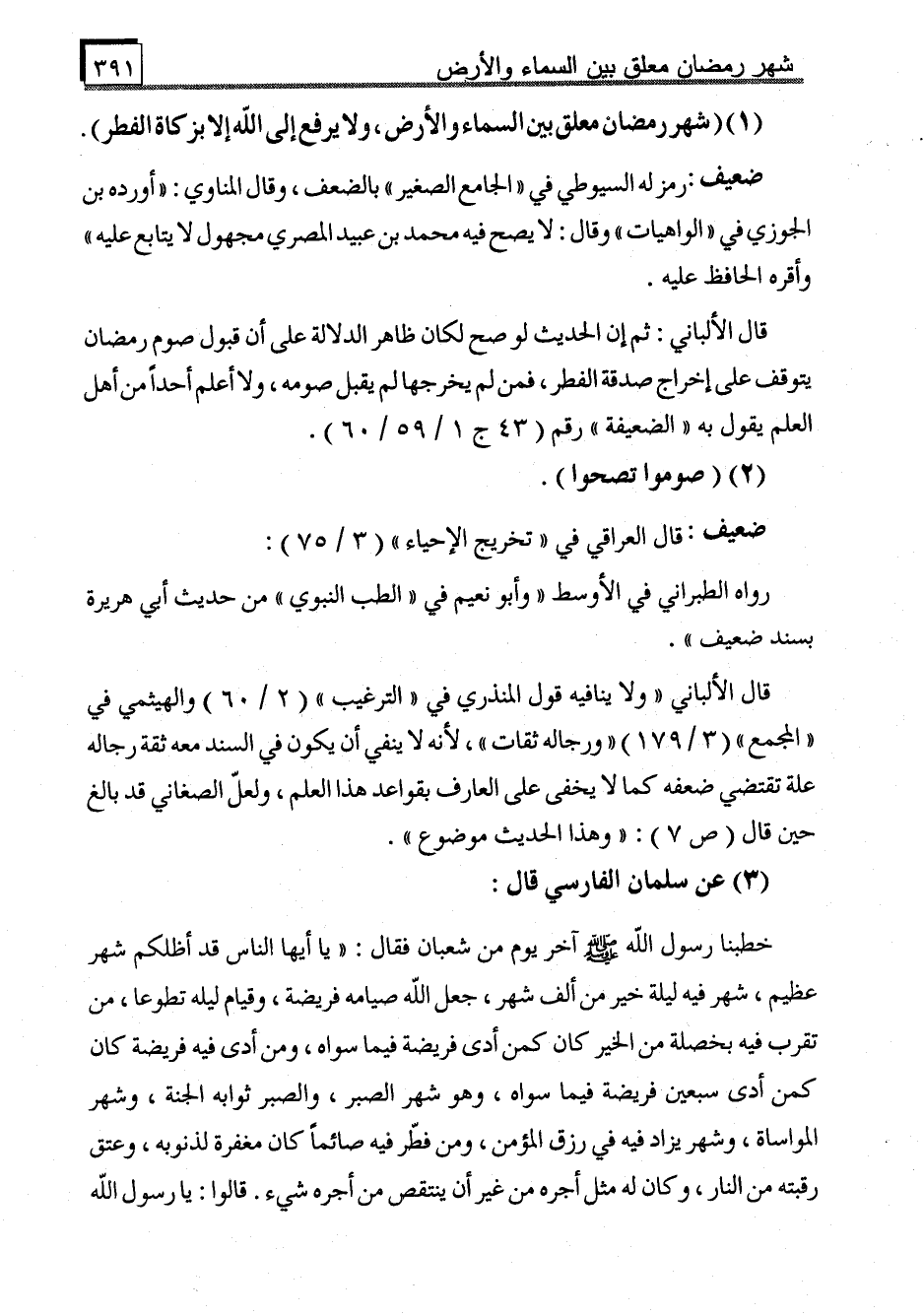 قال الألباني: ثم إن الحديث لو صح لكان ظاهر الدلالة على أن قبول صوم رمضان يتوقف على إخراج صدقة الفطر، فمن لم يخرجها لم يقبل صومه، ولا أعلم أحداً من أهل العلم يقول به "الضعيفة" رقم (43 ج 1/59/60) .