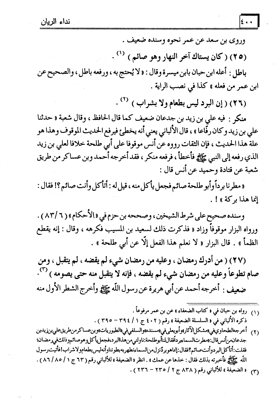(2) أخرجه الطحاوي في "مشكل الآثار" وأبو يعلى في "مسنده" والسلفي في "الطيوريات" وبن عساكر من طريق علي بن زيد بن جدعان من أنس قال: "مطرت السماء بردا فقال لنا أبو طلحة: ناولني من هذا البرد، فجعل يأكل وهو صائم وذلك في رمضان؛ فقلت: أتأكل البرد وأنت صائم؟ فقال: إنما هو برد نزل من السماء نطهر به بطوننا وأنه ليس بطعام ولا شراب! فأتيت رسول الله - صَلَّى اللَّهُ عَلَيْهِ وَسَلَّمَ - فأخبرته بذلك فقال: خذها عن عمك". انظر "الضعيفة" للألباني رقم (63 ج 1/85/86) .