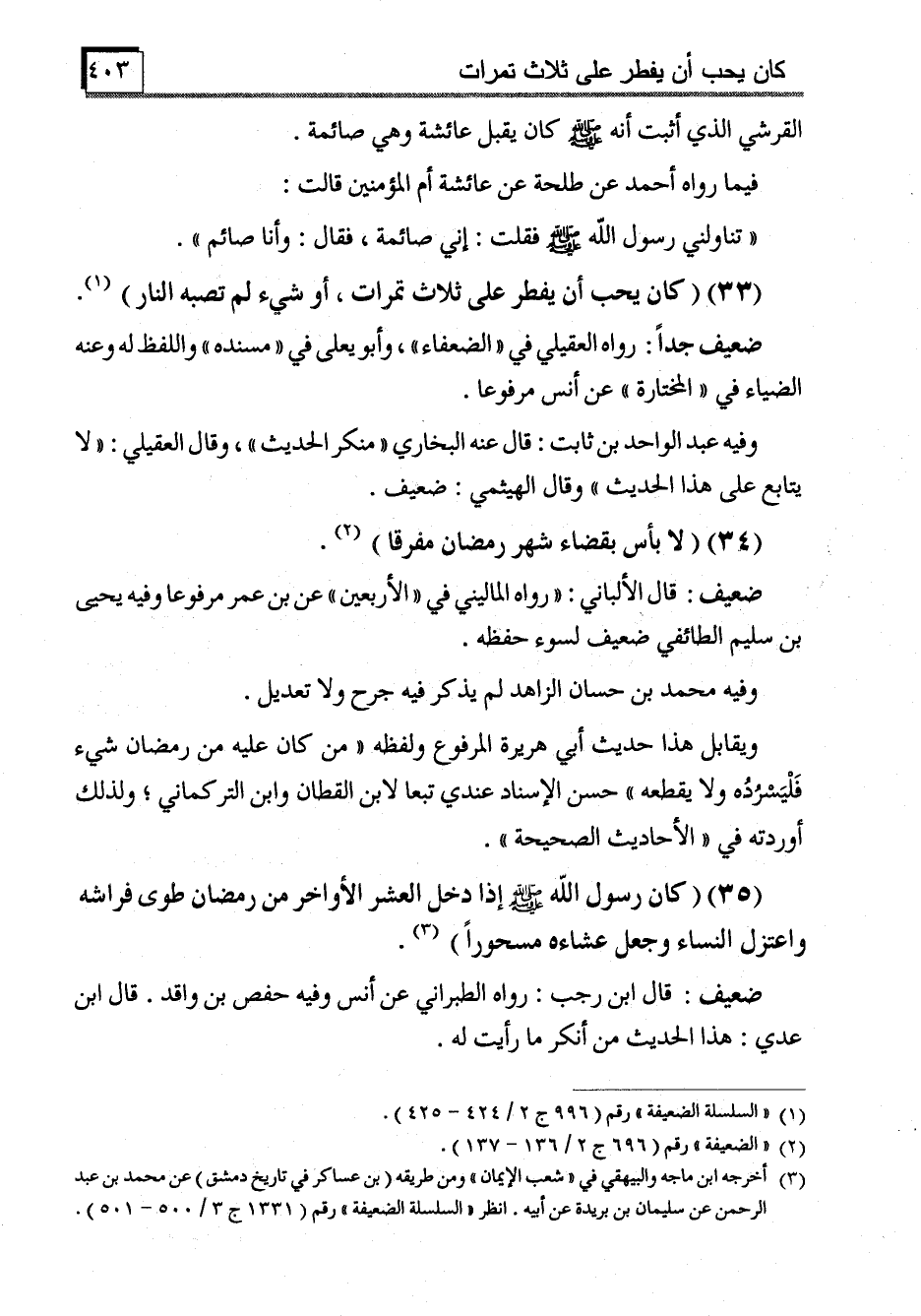 (33) (كان يحب أن يفطر على ثلاث تمرات، أو شيء لم تصبه النار) (1) .