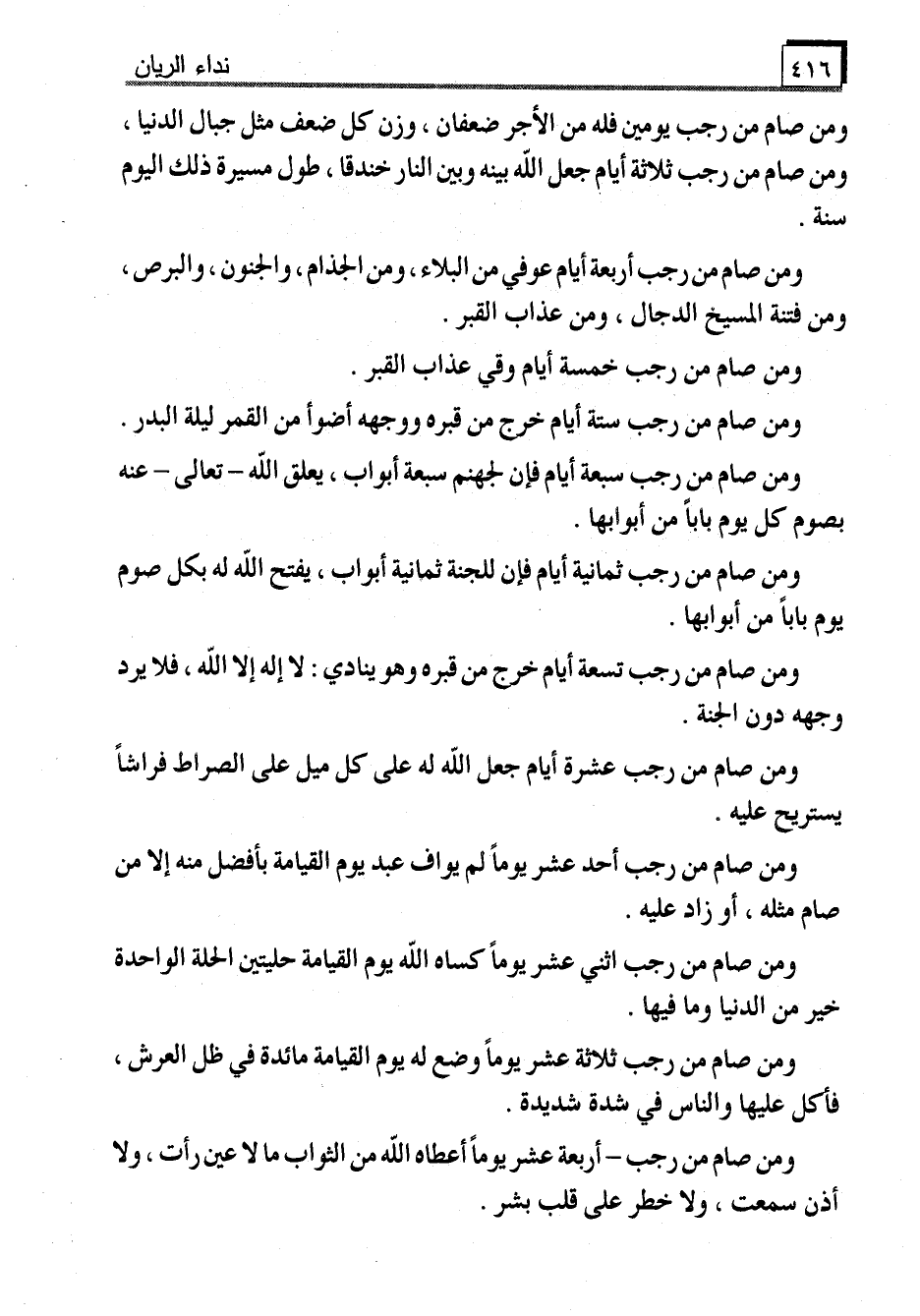 ومن صام من رجب - أربعة عشر يوماً أعطاه الله من الثواب ما لا عين رأت، ولا أذن سمعت، ولا خطر على قلب بشر.