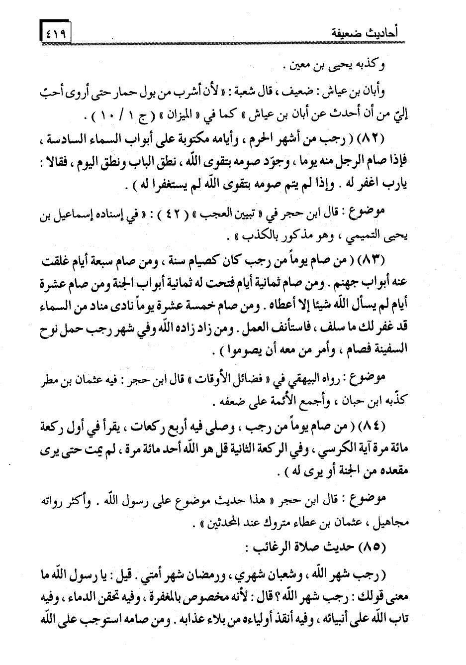 (83) (من صام يوماً من رجب كان كصيام سنة، ومن صام سبعة أيام غلقت عنه أبواب جهنم. ومن صام ثمانية أيام فتحت له ثمانية أبواب الجنة ومن صام عشرة أيام لم يسأل الله شيئاً إلا أعطاه. ومن صام خمسة عشرة يوماً نادى مناد من السماء قد غفر لك ما سلف، فاستأنف العمل. ومن زاد زاده الله وفي شهر رجب حمل نوح السفينة فصام، وأمر من معه أن يصوموا) .