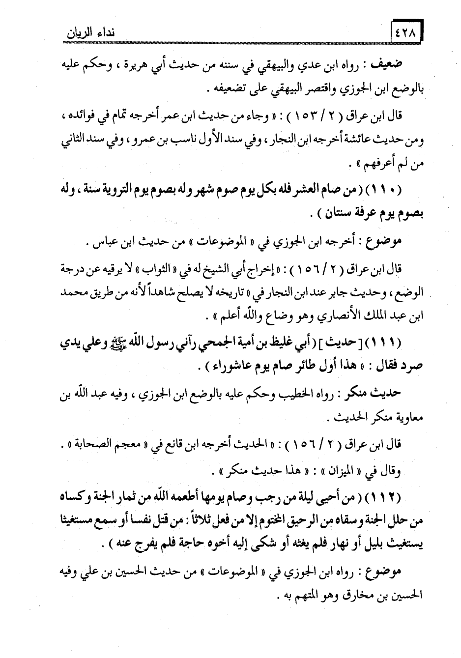 (110) (من صام العشر فله بكل يوم صوم شهر وله بصوم يوم التروية سنة، وله بصوم يوم عرفة سنتان) .