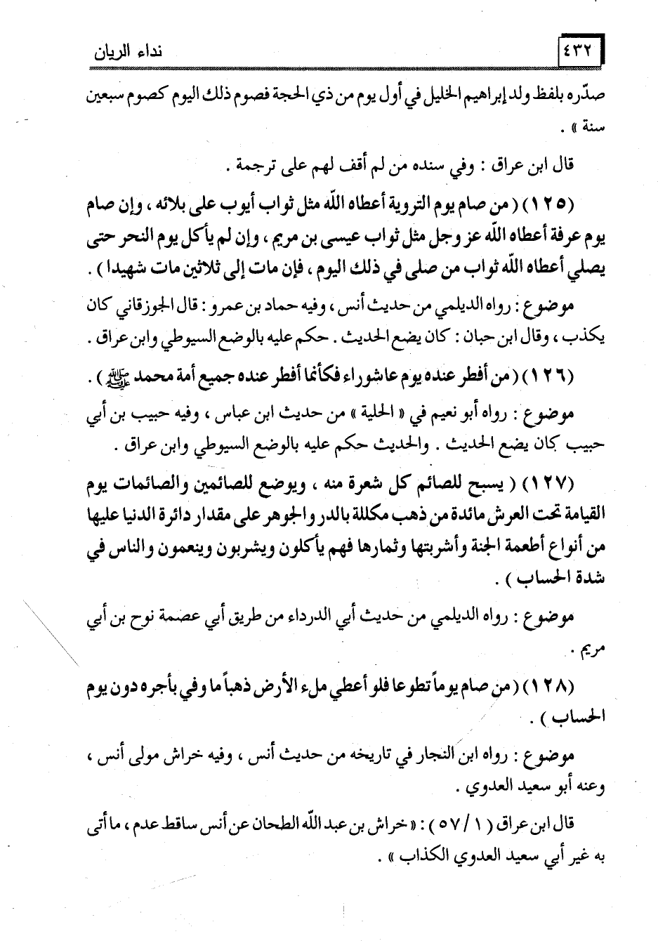 (125) (من صام يوم التروية أعطاه الله مثل ثواب أيوب على بلائه، وإن صام يوم عرفة أعطاه الله عز وجل مثل ثواب عيسى بن مريم، وإن لم يأكل يوم النحر حتى يصلي أعطاه الله ثواب من صلى في ذلك اليوم، فإن مات إلى ثلاثين مات شهيدا) .