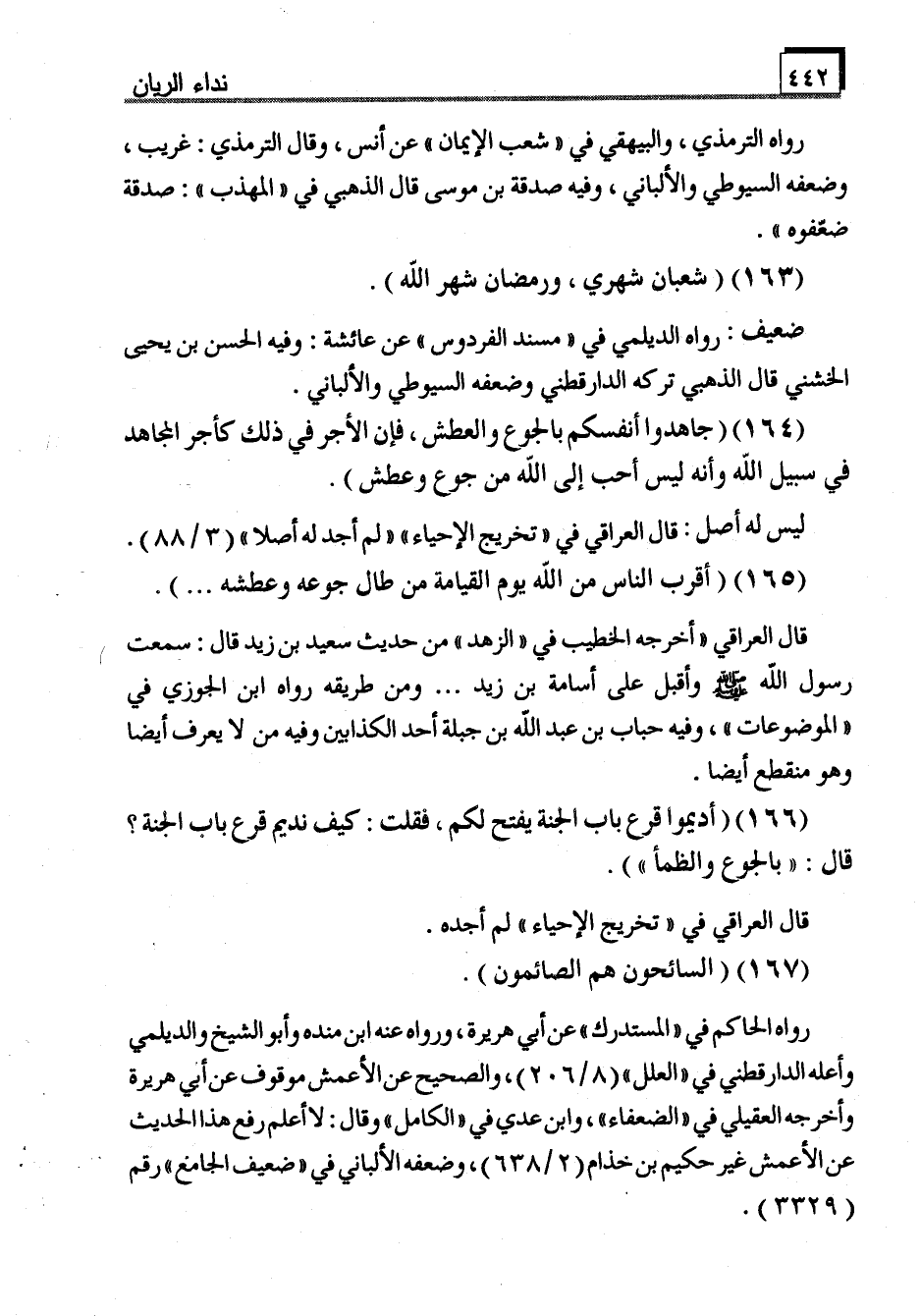 (164) (جاهدوا أنفسكم بالجوع والعطش، فإن الأجر في ذلك كأجر المجاهد في سبيل الله وأنه ليس أحب إلى الله من جوع وعطش) .