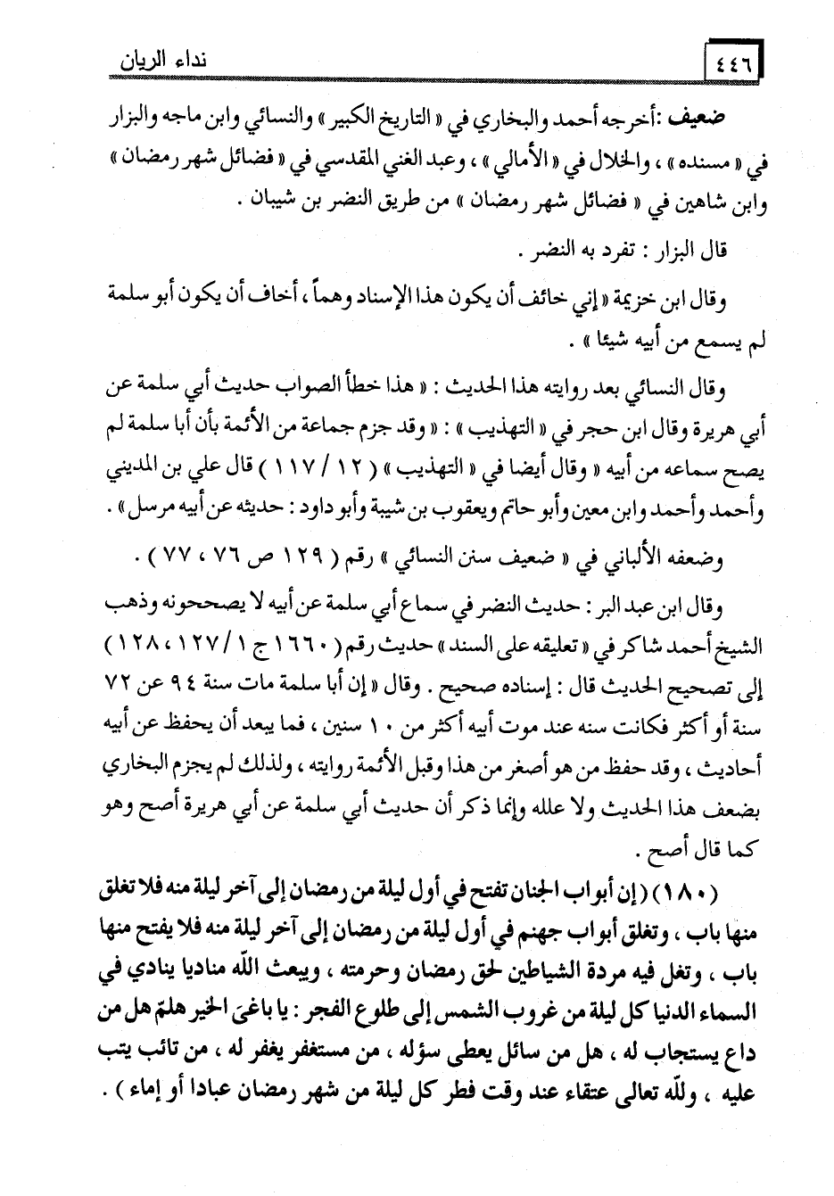 (180) (إن أبواب الجنان تفتح في أول ليلة من رمضان إلى آخر ليلة منه فلا تغلق منها باب، وتغلق أبواب جهنم في أول ليلة من رمضان إلى آخر ليلة منه فلا يفتح منها باب، وتغل فيه مردة الشياطين لحق رمضان وحرمته، ويبعث الله مناديا ينادي في السماء الدنيا كل ليلة من غروب الشمس إلى طلوع الفجر: يا باغىَ الخير هلم هل من داع يستجاب له، هل من سائل يعطى سؤله، من مستغفر يغفر له، من تائب يتب عليه، ولله تعالى عتقاء عند وقت فطر كل ليلة من شهر رمضان عبادا أو إماء) .