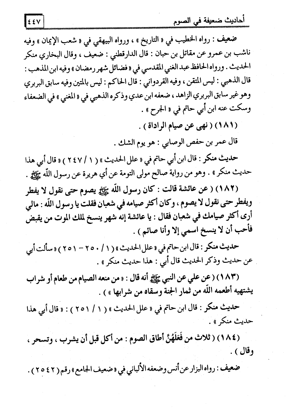 (182) (عن عائشة قالت: كان رسول الله - صَلَّى اللَّهُ عَلَيْهِ وَسَلَّمَ - يصوم حتى نقول لا يفطر ويفطر حتى نقول لا يصوم، وكان أكثر صيامه في شعبان فقلت يا رسول الله: مالي أرى أكثر صيامك في شعبان فقال: يا عائشة إنه شهر ينسخ لملك الموت من يقبض فأحب أن لا ينسخ اسمي إلا وأنا صائم) .
