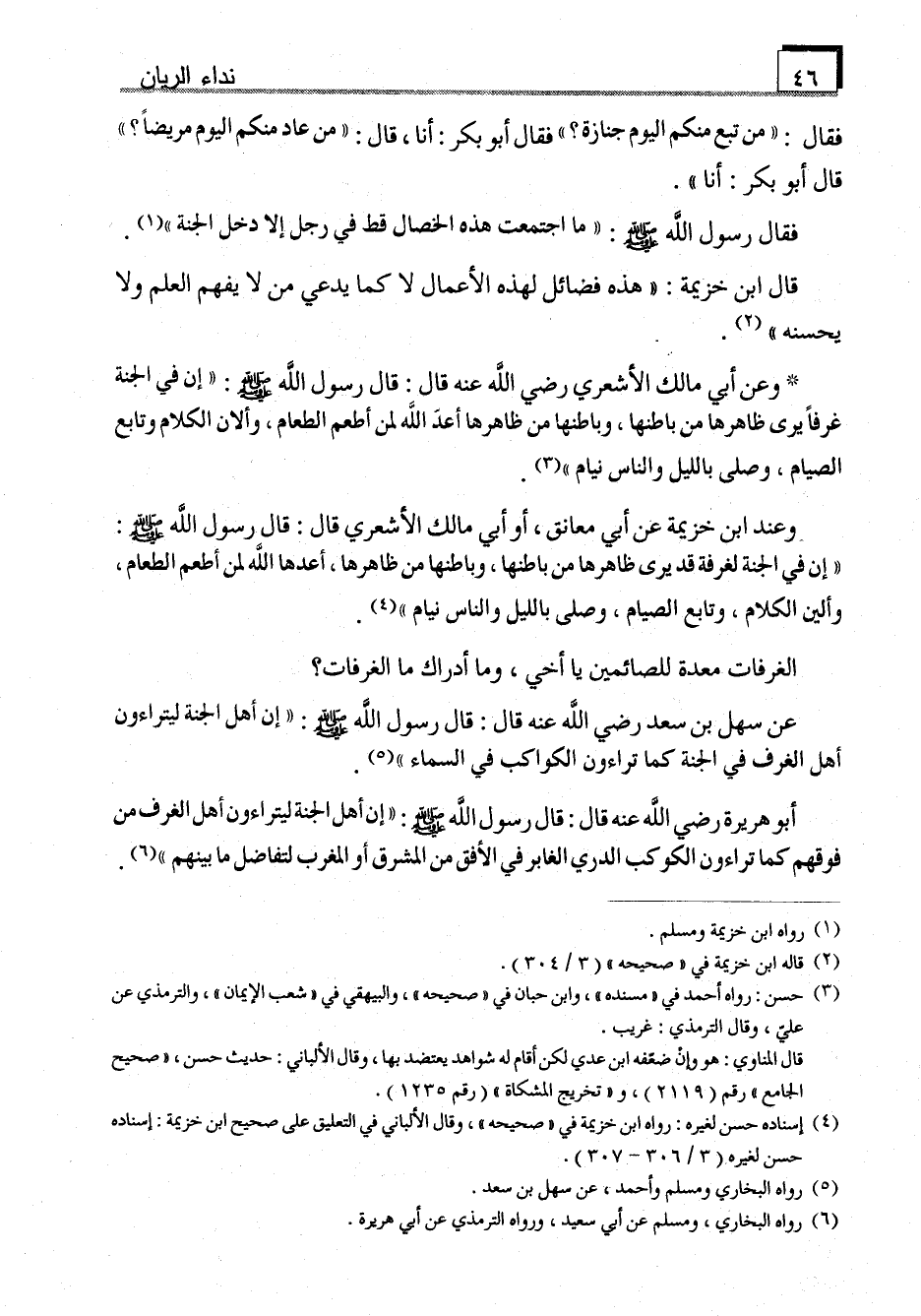 فقال رسول الله - صَلَّى اللَّهُ عَلَيْهِ وَسَلَّمَ -: " ما اجتمعت هذه الخصال قط في رجل إلا دخل الجنة" (1) قال ابن خزيمة: " هذه فضائل لهذه الأعمال لا كما يدعي من لا يفهم العلم ولا يحسنه" (2) .