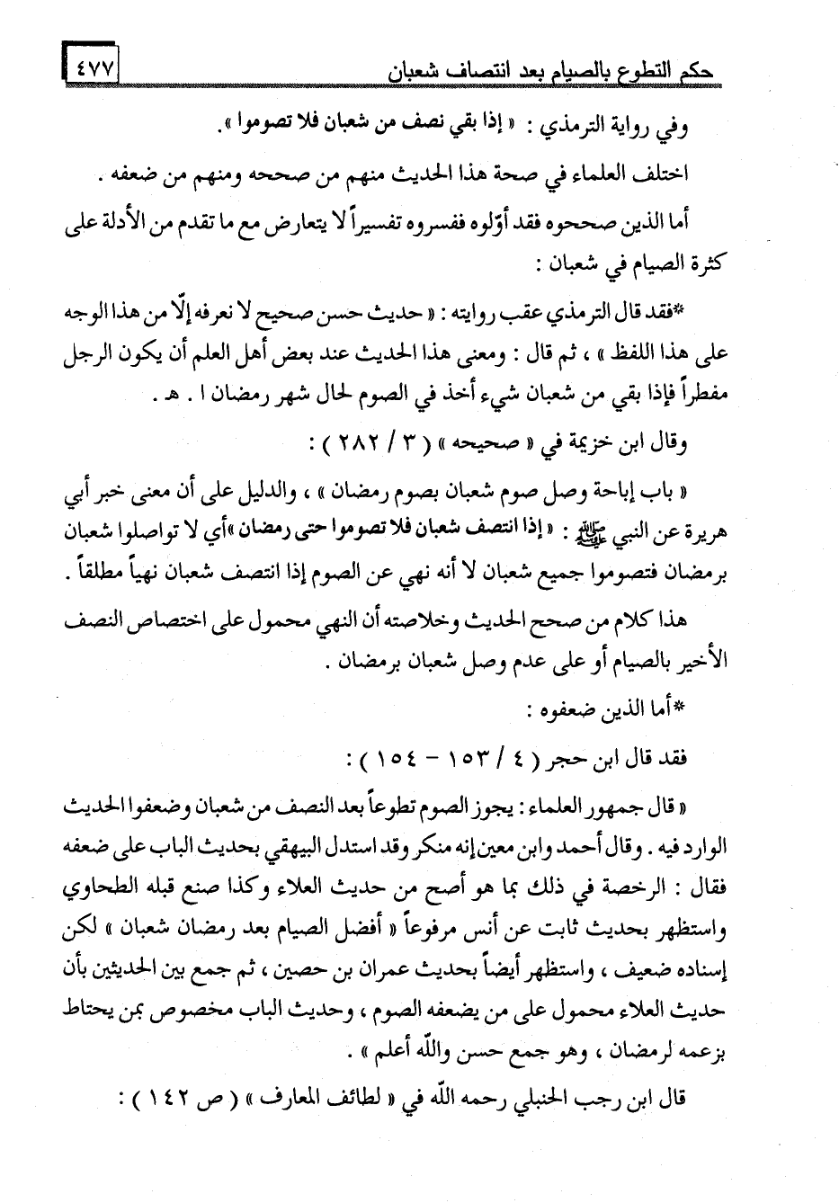 "قال جمهور العلماء. يجوز الصوم تطوعاً بعد النصف من شعبان وضعفوا الحديث الوارد فيه. وقال أحمد وابن معين إنه منكر وقد استدل البيهقي بحديث الباب على ضعفه فقال: الرخصة في ذلك بما هو أصح من حديث العلاء وكذا صنع قبله الطحاوي واستظهر بحديث ثابت عن أنس مرفوعاً "أفضل الصيام بعد رمضان شعبان" لكن إسناده ضعيف، واستظهر أيضاً بحديث عمران بن حصين، ثم جمع بين الحديثين بأن حديث العلاء محمول على من يضعفه الصوم، وحديث الباب مخصوص بمن يحتاط بزعمه لرمضان، وهو جمع حسن والله أعلم".