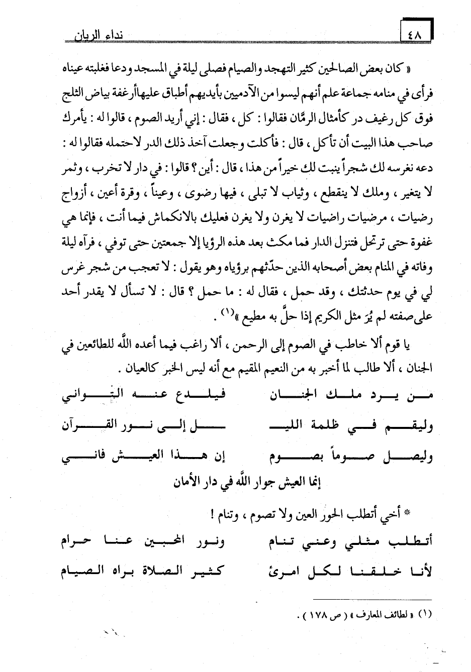 "كان بعض الصالحين كثير التهجد والصيام فصلى ليلة في المسجد ودعا فغلبته عيناه فرأى في منامه جماعة علم أنهم ليسوا من الآدميين بأيديهم أطباق عليها أرغفة بياض الثلج فوق كل رغيف در كأمثال الرمَّان فقالوا: كل، فقال: إني أريد الصوم، قالوا له: يأمرك صاحب هذا البيت أن تأكل، قال: فأكلت وجعلت آخذ ذلك الدر لاحتمله فقالوا له: دعه نغرسه لك شجراً ينبت لك خيراً من هذا، قال: أين؟ قالوا: في دار لا تخرب، وثمر لا يتغير، وملك لا ينقطع، وثياب لا تبلى، فيها رضوى، وعيناً، وقرة أعين، أزواج رضيات، مرضيات راضيات لا يغرن ولا يغرن فعليك بالانكماش فيما أنت، فإنما هي غفوة حتى ترتحل فتنزل الدار فما مكث بعد هذه الرؤيا إلا جمعتين حتى توفي، فرآه ليلة وفاته في المنام بعض أصحابه الذين حدّثهم برؤياه وهو يقول: لا تعجب من شجر غرس لي في يوم حدثتك، وقد حمل، فقال له: ما حمل؟ قال: لا تسأل لا يقدر أحد على صفته لم ير مثل الكريم إذا حلَّ به مطيع" (1) .