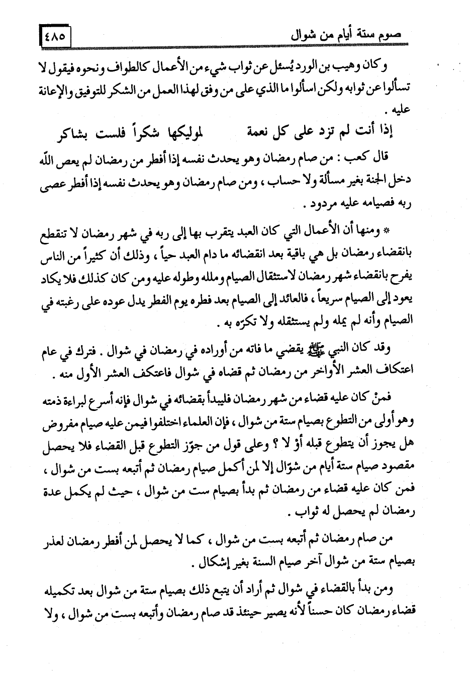 * ومنها أن الأعمال التي كان العبد يتقرب بها إلى ربه في شهر رمضان لا تنقطع بانقضاء رمضان بل هي باقية بعد انقضائه ما دام العبد حياً، وذلك أن كثيراً من الناس يفرح بانقضاء شهر رمضان لاستثقال الصيام وملله وطوله عليه ومن كان كذلك فلا يكاد يعود إلى الصيام سريعاً، فالعائد إلى الصيام بعد فطره يوم الفطر يدل عوده على رغبته في الصيام وأنه لم يمله ولم يستثقله ولا تكره به.