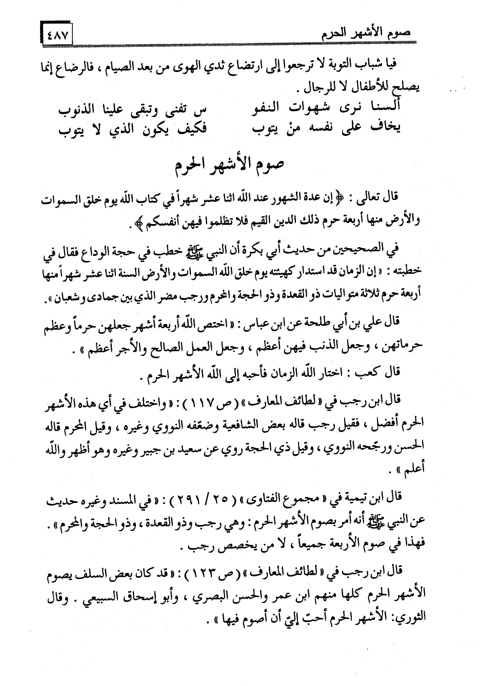 قال ابن تيمية في "مجموع الفتاوى" (25/291) : "في المسند وغيره حديث عن النبي - صَلَّى اللَّهُ عَلَيْهِ وَسَلَّمَ - أنه أمر بصوم الأشهر الحرم: وهي رجب وذو القعدة، وذو الحجة والمحرم".
