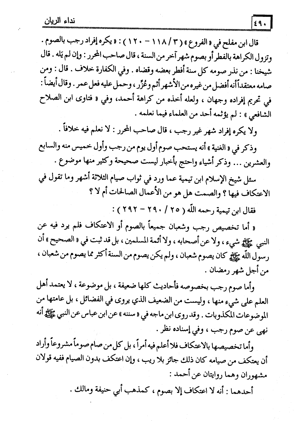 "أما تخصيص رجب وشعبان جميعاً بالصوم أو الاعتكاف فلم يرد فيه عن النبي - صَلَّى اللَّهُ عَلَيْهِ وَسَلَّمَ - شيء، ولا عن أصحابه، ولا أئمة المسلمين، بل قد ثبت في "الصحيح" أن رسول الله - صَلَّى اللَّهُ عَلَيْهِ وَسَلَّمَ - كان يصوم شعبان، ولم يكن يصوم من السنة أكثر مما يصوم من شعبان، من أجل شهر رمضان.