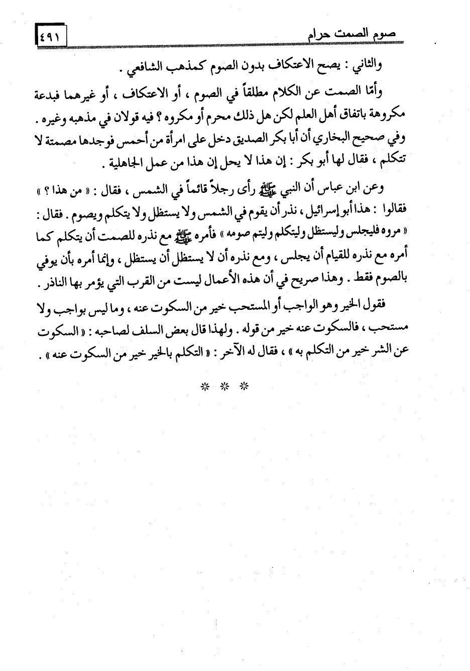 وأمّا الصمت عن الكلام مطلقاً في الصوم، أو الاعتكاف، أو غيرهما فبدعة مكروهة باتفاق أهل العلم لكن هل ذك محرم أو مكروه؟ فيه قولان في مذهبه وغيره.