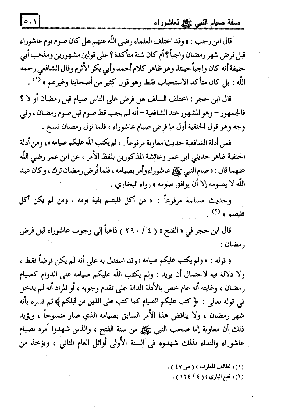 قال ابن رجب: "وقد اختلف العلماء رضي الله عنهم هل كان صوم يوم عاشوراء قبل فرض شهر رمضان واجبا؟ أم كان سُنة متأكدة؟ على قولين مشهورين ومذهب أبي حنيفة أنه كان واجباً حينئذ وهو ظاهر كلام أحمد وأبي بكر الأثرم وقال الشافعي رحمه الله: بل كان متأكد الاستحباب فقط وهو قول كثير من أصحابنا وغيرهم" (1) .