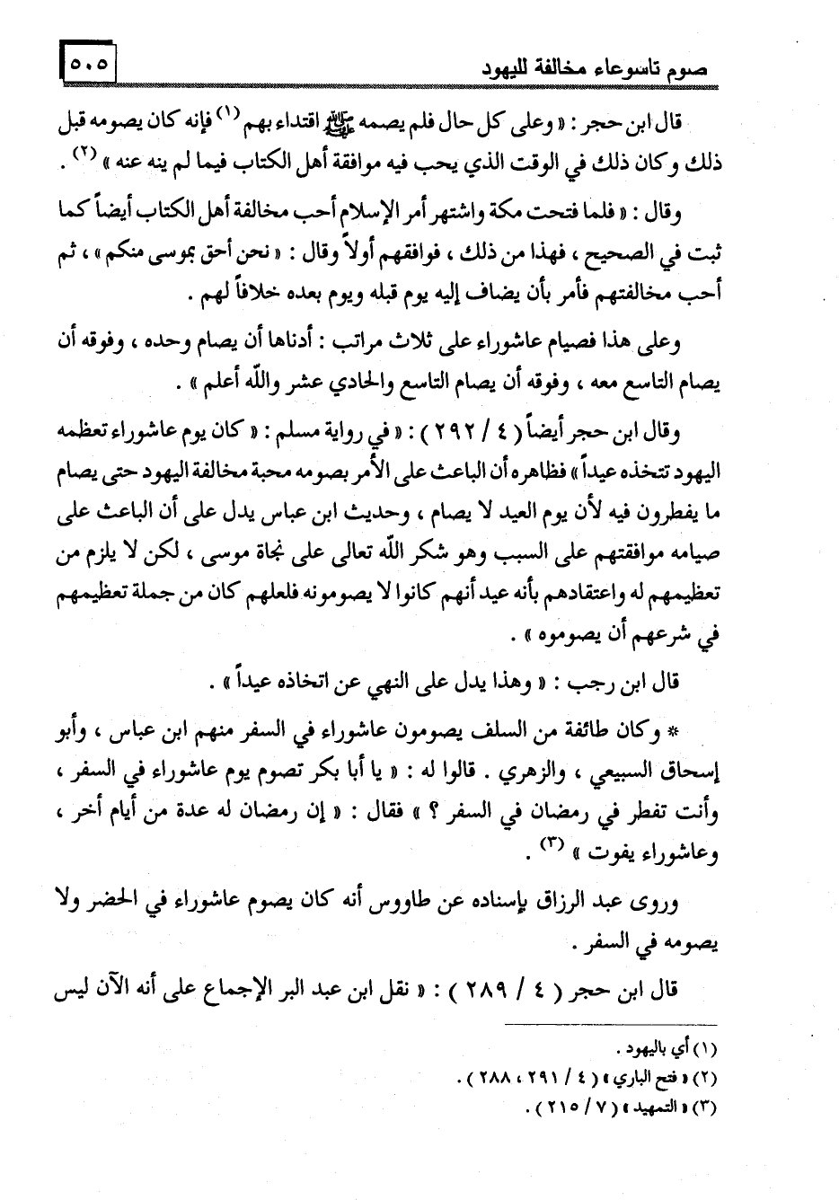 وقال ابن حجر أيضاً (4/292) : "في رواية مسلم: "كان يوم عاشوراء تعظمه اليهود تتخذه عيدا" فظاهره أن الباعث على الأمر بصومه محبة مخالفة اليهود حتى يصام ما يفطرون فيه لأن يوم العيد لا يصام، وحديث ابن عباس يدل على أن الباعث على صيامه موافقتهم على السبب وهو شكر الله تعالى على نجاة موسى، لكن لا يلزم من تعظيمهم له واعتقادهم بأنه عيد أنهم كانوا لا يصومونه فلعلهم كان من جملة تعظيمهم في شرعهم أن يصوموه".