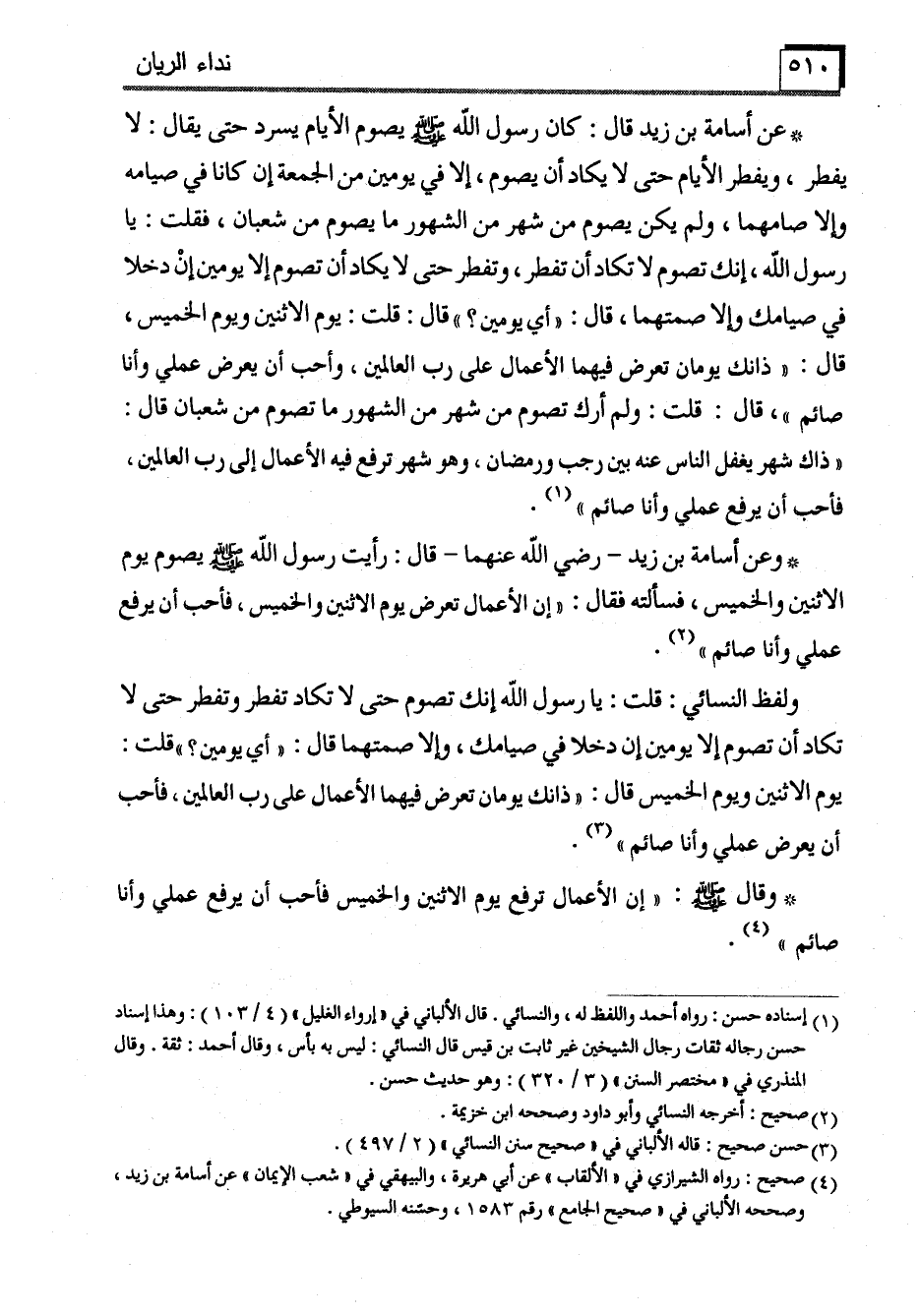 * وعن أسامة بن زيد -رضي الله عنهما- قال: رأيت رسول الله - صَلَّى اللَّهُ عَلَيْهِ وَسَلَّمَ - يصوم يوم الاثنين والخميس، فسألته فقال: "إن الأعمال تعرض يوم الاثنين والخميس، فأحب أن يرفع عملي وأنا صائم" (2) .