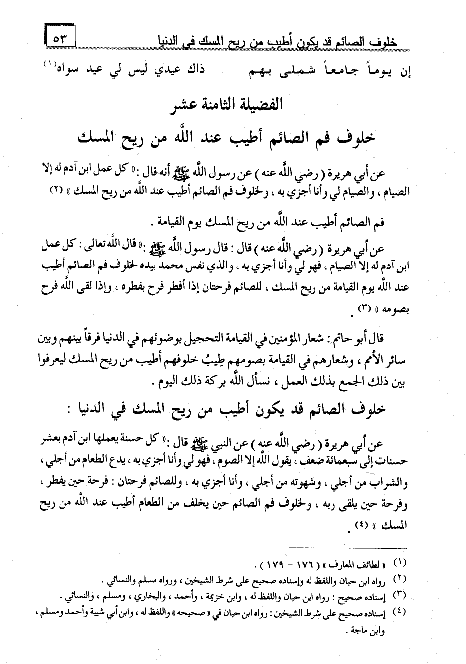 عن أبي هريرة (رضي الله عنه) قال: قال رسول الله - صَلَّى اللَّهُ عَلَيْهِ وَسَلَّمَ -: "قال الله تعالى: كل عمل ابن آدم له إلا الصيام، فهو لي وأنا أجزي به، والذي نفس محمد بيده لخلوف فم الصائم أطيب عند الله يوم القيامة من ريح المسك، للصائم فرحتان إذا أفطر فرح بفطره، وإذا لقى الله فرح بصومه" (3) .
