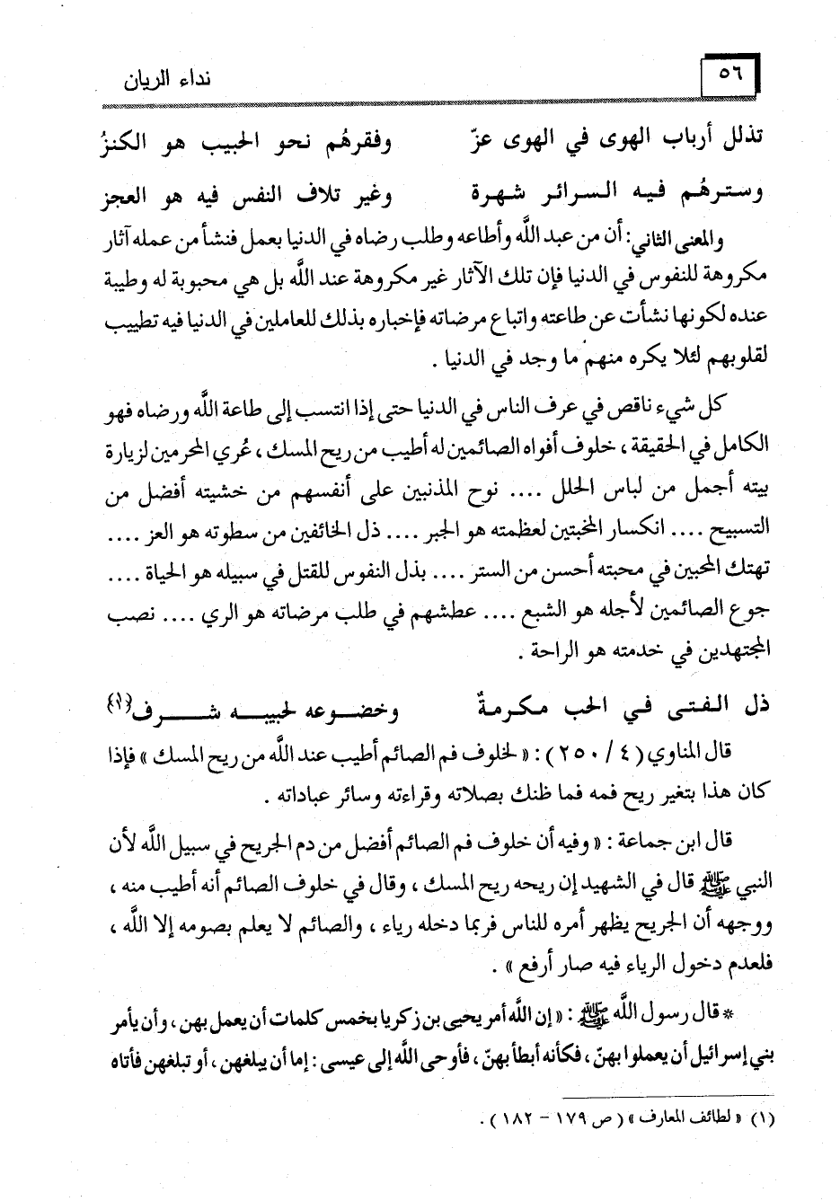 كل شيء ناقص في عرف الناس في الدنيا حتى إذا انتسب إلى طاعة الله ورضاه فهو الكامل في الحقيقة، خلوف أفواه الصائمين له أطيب من ريح المسك، عُري المحرمين لزيارة ييته أجمل من لباس الحلل.... نوح المذنبين على أنفسهم من خشيته أفضل من التسبيح.... انكسار المخبتين لعظمته هو الجبر.... ذل الخائفين من سطوته هو العز.... تهتك المحبين في محبته أحسن من الستر.... بذل النفوس للقتل في سبيله هو الحياة.... جوع الصائمين لأجله هو الشبع.... عطشهم في طلب مرضاته هو الري.... نصب المجتهدين في خدمته هو الراحة.