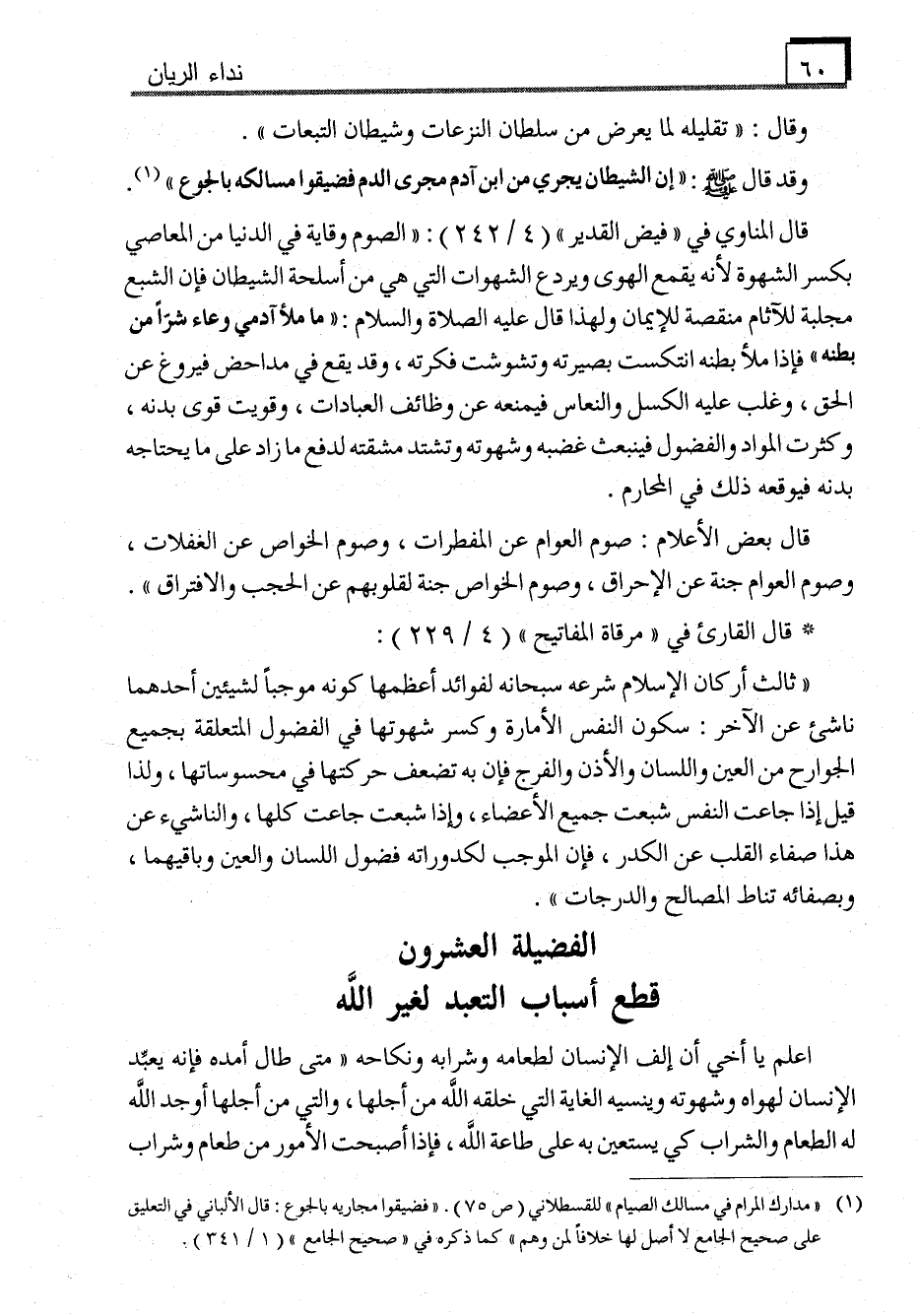 (1) "مدارك المرام في مسالك الصيام" للقسطلاني (ص 75) . "فضيقوا مجاريه بالجوع: قال الألباني في التعليق