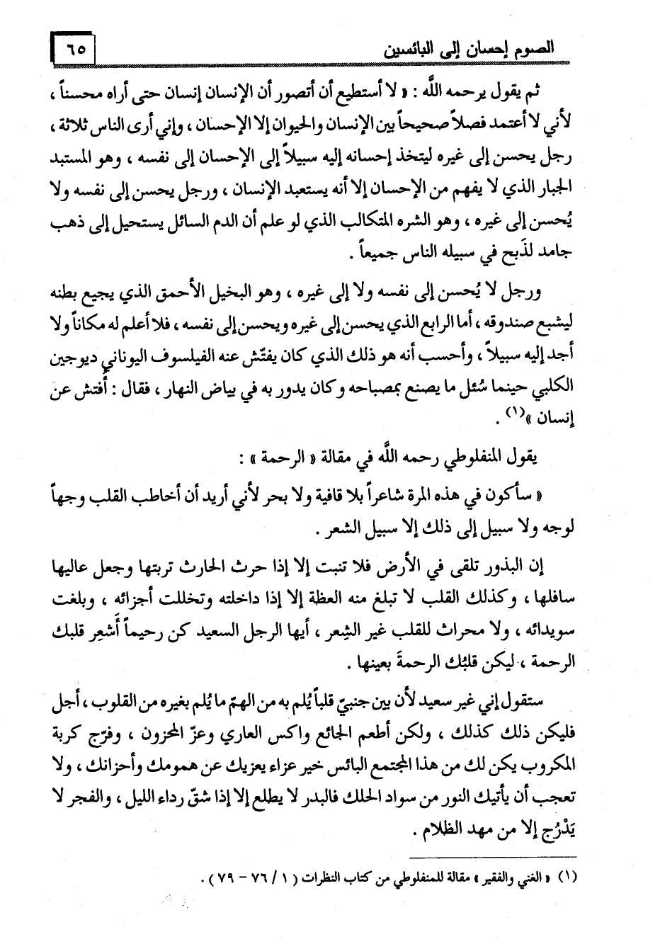 (1) "الغني والفقير" مقالة للمنفلوطي من كتاب النظرات (1/76-79) .