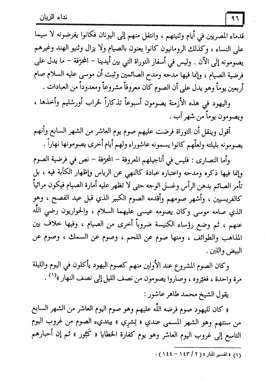"كان لليهود صوم فرضه الله عليهم وهو صوم اليوم العاشر من الشهر السابع من سنتهم وهو الشهر المسمى عندي "تِسْرِي" يبتديء الصوم من غروب اليوم التاسع إلى غروب اليوم العاشر وهو يوم كفارة الخطايا "كَبُّور" ثم إن أحبارهم