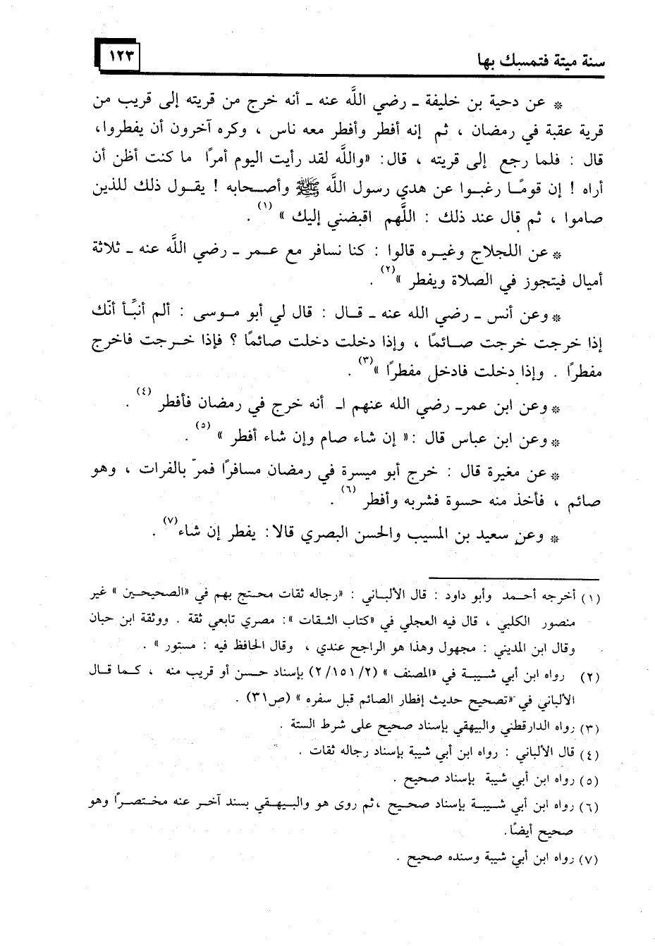 * عن دحية بن خليفة -رضي الله عنه- أنه خرج من قريته إلى قريب من قرية عقبة في رمضان، ثم إنه أفطر وأفطر معه ناس، وكره آخرون أن يفطروا، قال: فلما رجع إلى قريته، قال: "والله لقد رأيت اليوم أمرًا ما كنت أظن أن أراه! إن قومًا رغبوا عن هدي رسول الله - صَلَّى اللَّهُ عَلَيْهِ وَسَلَّمَ - وأصحابه! يقول ذلك للذين صاموا، ثم قال عند ذلك: اللَّهم اقبضني إليك" (1) .
