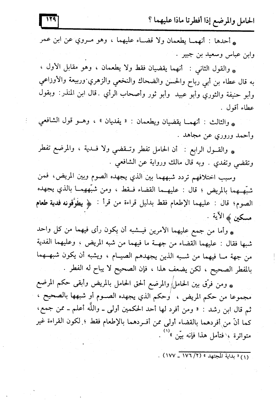* ومن فرّق بين الحامل والمرضع ألحق الحامل بالمريض وأبقى حكم المرضع مجموعا من حكم المريض، وحكم الذي يجهده الصوم أو شبهها بالصحيح، ثم قال ابن رشد: "ومن أفرد لها أحد الحكمين أولى -والله أعلم- ممن جمع، كما أنّ من أفردهما بالقضاء أولى ممن أفردهما بالإطعام فقط؛ لكون القراءة غير متواترة، فتأمل هذا فإنه بيّن" (1) .