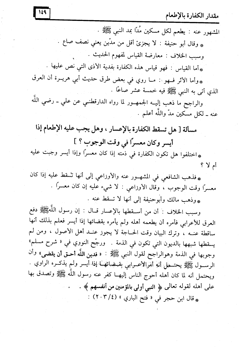 وسبب الخلاف: أن من أسقطها بالإعسار قال: إن رسول الله - صَلَّى اللَّهُ عَلَيْهِ وَسَلَّمَ - دفع العرق للأعرابي فأمره أن يطعمه أهله ولم يأمره بقضائها إذا أيسر فعلم بذلك أنها ساقطة عنه، وترك البيان وقت الحاجة لا يجوز عند أهل الأصول، ومن لم يسقطها شبهها بالديون التي تكون في الذمة. ورجّح النووي في "شرح مسلم" وجوبها في الذمة وهو الراجح لقول النبي - صَلَّى اللَّهُ عَلَيْهِ وَسَلَّمَ -: "فدين الله أحق أن يقضى" وأن الرسول - صَلَّى اللَّهُ عَلَيْهِ وَسَلَّمَ - يحتمل أنه أمر الإعرابي بقضائها إذا أيسر ولم يذكره الراوي.