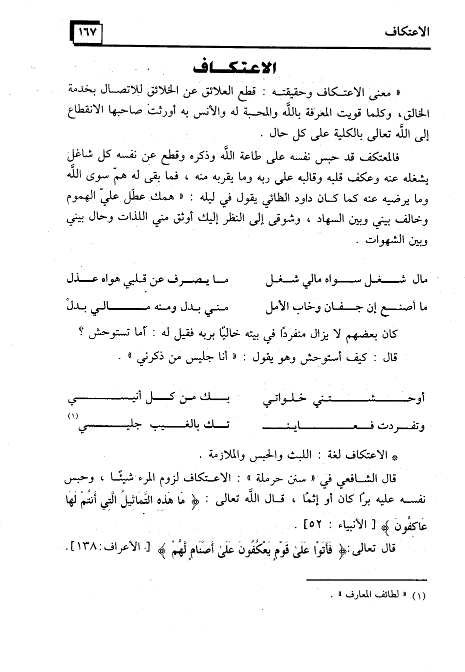 "معنى الاعتكاف وحقيقته: قطع العلائق عن الخلائق للاتصال بخدمة الخالق، وكلما قويت المعرفة بالله والمحبة له والأنس به أورثت صاحبها الانقطاع إلى الله تعالى بالكلية على كل حال.