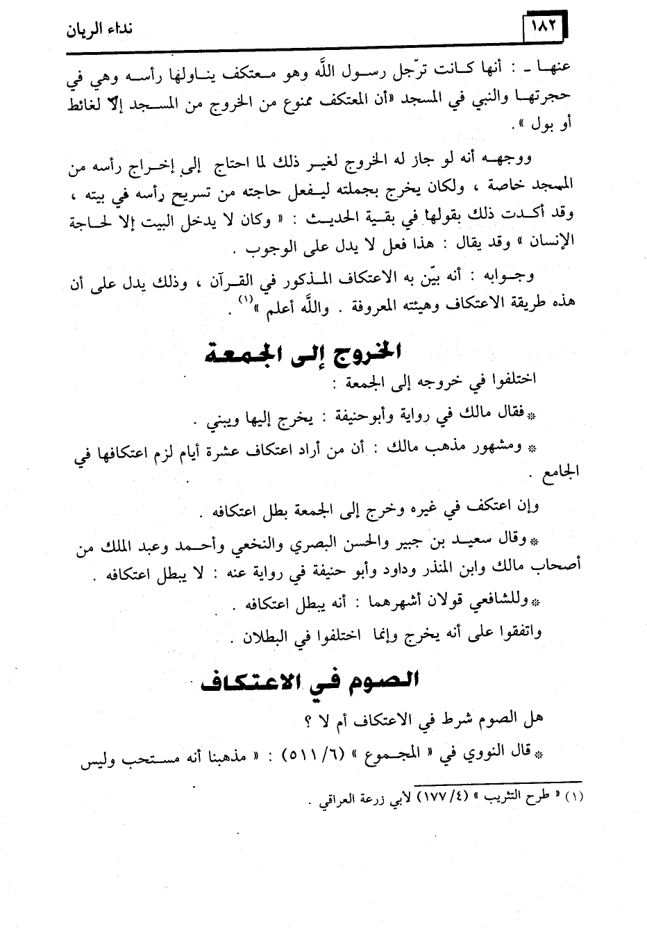 عنها-: أنها كانت ترّجل رسول الله وهو معتكف يناولها رأسه وهي في حجرتها والنبي في المسجد "أن المعتكف ممنوع من الخروج من المسجد إلا لغائط أو بول".
