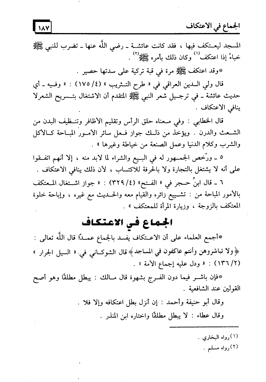 6- قال ابنُ حجر في "الفتح" (4/329) : "جواز اشتغال المعتكف بالأمور المباحة من: تشييع زائره والقيام معه والحديث مع غيره، وإباحة خلوة المعتكف بالزوجة، وزيارة المرأة للمعتكف".