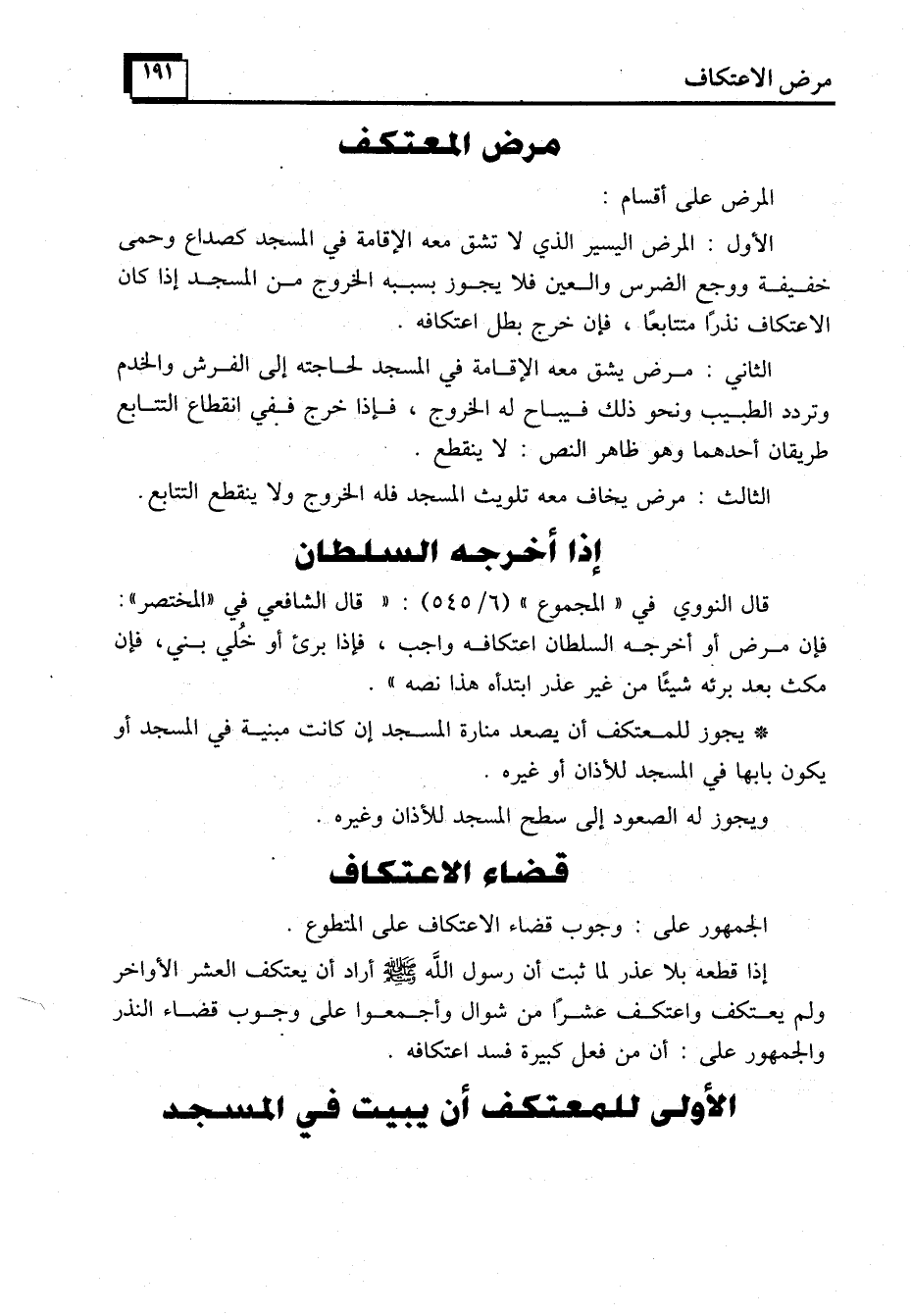 الأول: المرض اليسير الذي لا تشق معه الإقامة في المسجد كصداع وحمى خفيفة ووجع الضرس والعين فلا يجوز بسببه الخروج من المسجد إذا كان الاعتكاف نذرًا متتابعًا، فإنا خرج بطل اعتكافه.