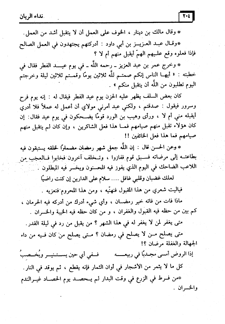 * وخرج عمر بن عبد العزيز -رحمه الله- في يوم عيد الفطر فقال في خطبته: "أيها الناس إنكم صمتم لله ثلاثين يومًا وقمتم ثلاثين ليلة وخرجتم اليوم تطلبون من الله أن يتقبل منكم".