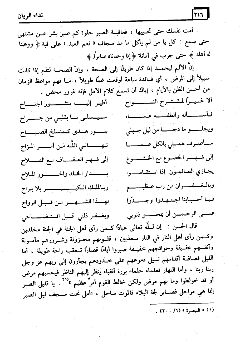 قال الحسن: إن لله تعالى عبادًا، كمن رأى أهل الجنة في الجنة مخلدين وكمن رأى أهل النار في النار معذبين، قلوبهم محزونة وشرورهم مأمونة وأنفسهم عفيفة وحوائجهم خفيفة صبروا أيامًا قصارًا تعقب راحة طويلة، أما الليل فصافة أقدامهم تسيل دموعهم على خدودهم يجأرون إلى ربهم عز وجل ربنا ربنا، وأما النهار فعلماء حلماء بررة أتقياء ينظر إليهم الناظر فيحسبهم عرض أو قد خولطوا وما بهم مرض ولكن خالط القوم أمرٌ عظيم" (1) . يا قليل الصبر إنما هي مراحل فصابر لجة البلاء فالموت ساحل، تأمل تحت سجف ليل الصبر