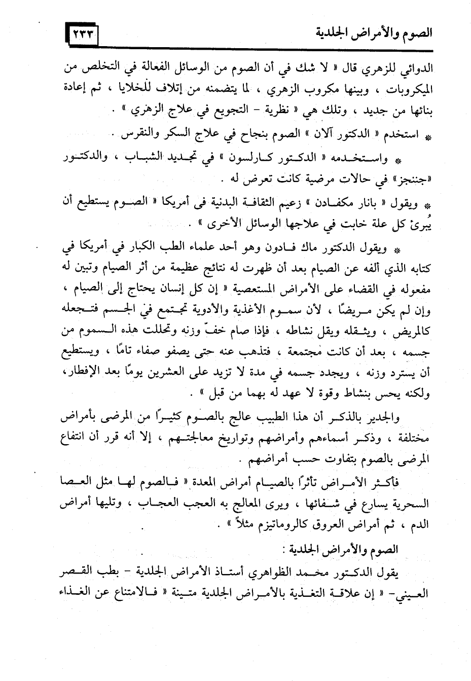 * ويقول "بانار مكفادن" زعيم الثقافة البدنية في أمريكا "الصوم يستطيع أن يُبرئ كل علة خابت في علاجها الوسائل الأخرى".