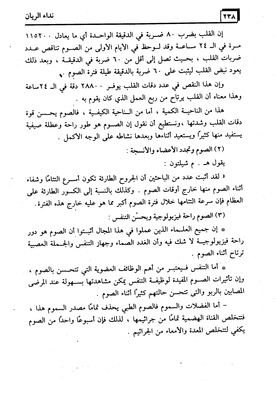 * إن جميع العلياء الذين عملوا في هذا المجال أثبتوا أن الصوم هو دور راحة فيزيولوجية لا شك فيه وأن الغدد الصماء وجهاز التنفس والجملة العصبية ترتاح أثناء الصوم.