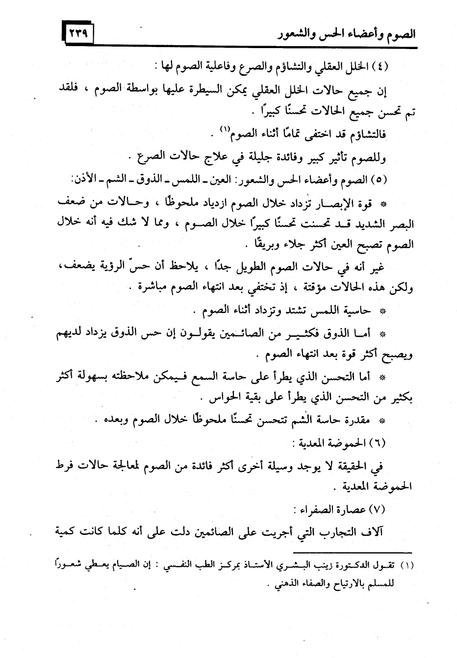 (1) تقول الدكتورة زينب البشري الأستاذ بمركز الطب النفسي: إن الصيام يعطي شعورًا للمسلم بالارتياح والصفاء الذهني.
