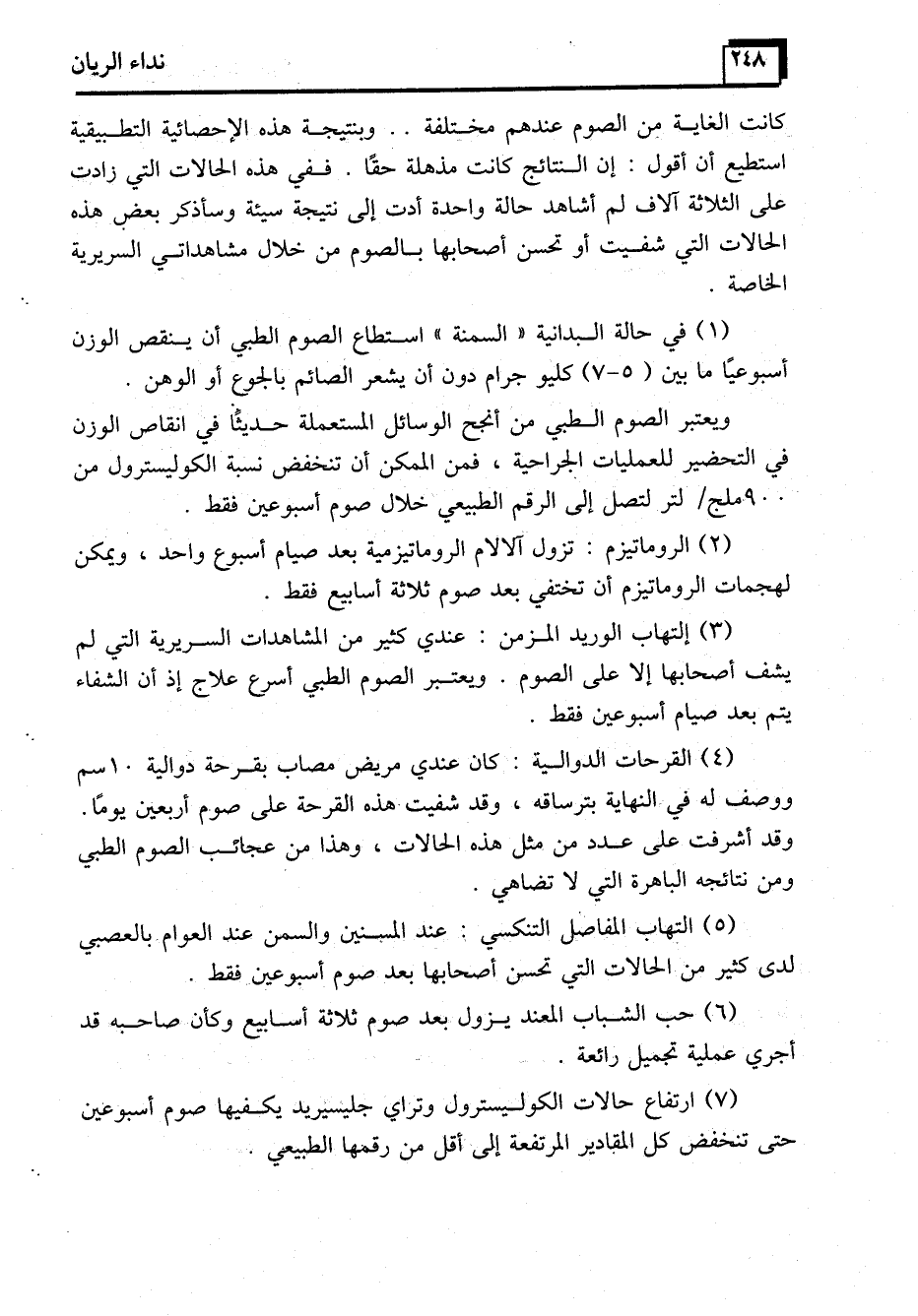 (7) ارتفاع حالات الكوليسترول وتراي جليسيريد يكفيها صوم أسبوعين حتى تنخفض كل المقادير المرتفعة إلى أقل من رقمها الطبيعي.