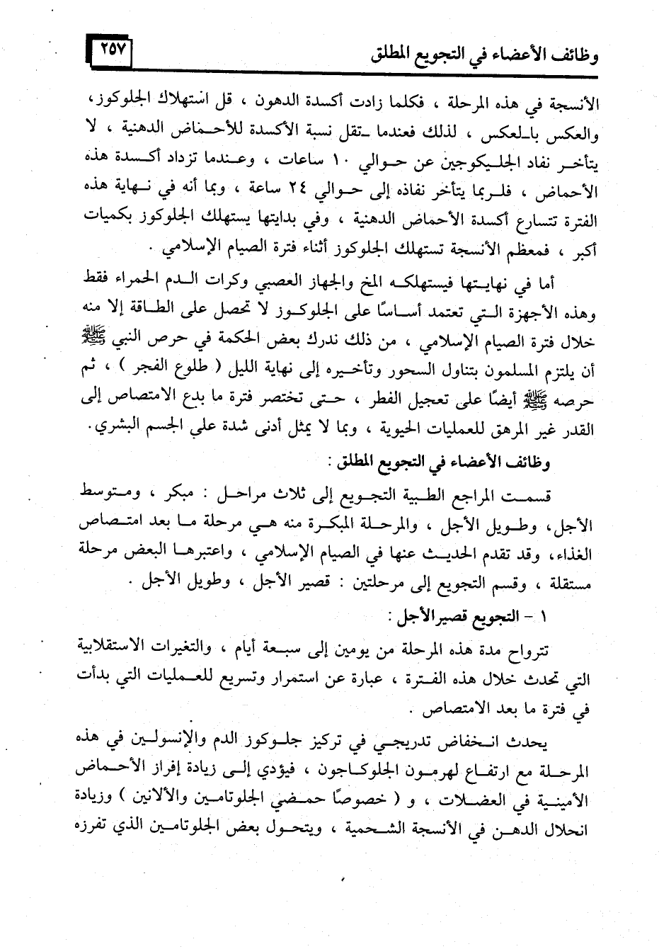 أما في نهايتها فيستهلكه المخ والجهاز العصبي وكرات الدم الحمراء فقط وهذه الأجهزة التي تعتمد أساسًا على الجلوكوز لا تحصل على الطاقة إلا منه خلال فترة الصيام الإسلامي، من ذلك ندرك بعض الحكمة في حرص النبي - صَلَّى اللَّهُ عَلَيْهِ وَسَلَّمَ - أن يلتزم المسلمون بتناول السحور وتأخيره إلى نهاية الليل (طلوع الفجر) ، ثم حرصه - صَلَّى اللَّهُ عَلَيْهِ وَسَلَّمَ - أيضاً على تعجيل الفطر، حتى تختصر فترة ما بعد الامتصاص إلى القدر غير المرهق للعمليات الحيوية، وبما لا يمثل أدنى شدة على الجسم البشري.