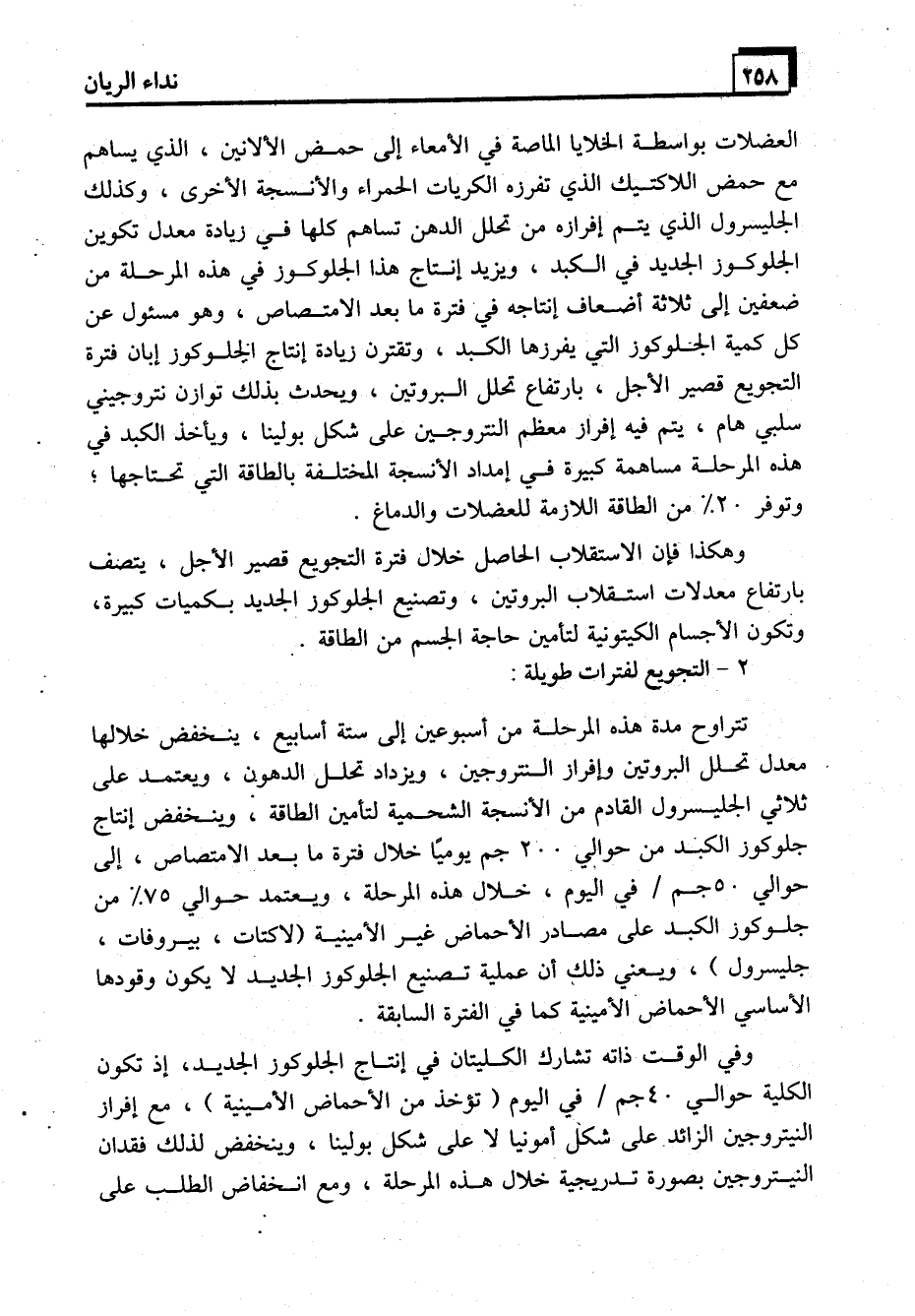 العضلات بواسطة الخلايا الماصة في الأمعاء إلى حمض الألانين، الذي يساهم مع حمض اللاكتيك الذي تفرزه الكريات الحمراء والأنسجة الأخرى، وكذلك الجليسرول الذي يتم إفرازه من تحلل الدهن تساهم كلها في زيادة معدل تكوين الجلوكوز الجديد في الكبد، ويزيد إنتاج هذا الجلوكوز في هذه المرحلة من ضعفين إلى ثلاثة أضعاف إنتاجه في فترة ما بعد الامتصاص، وهو مسئول عن كل كمية الجلوكوز التي يفرزها الكبد، وتقترن زيادة إنتاج الجلوكوز إبان فترة التجويع قصير الأجل، بارتفاع تحلل البروتين، ويحدث بذلك توازن نتروجيني سلبي هام، يتم فيه إفراز معظم النتروجين على شكل بولينا، ويأخذ الكبد في هذه المرحلة مساهمة كبيرة في إمداد الأنسجة المختلفة بالطاقة التي تحتاجها؛ وتوفر 20% من الطاقة اللازمة للعضلات والدماغ.