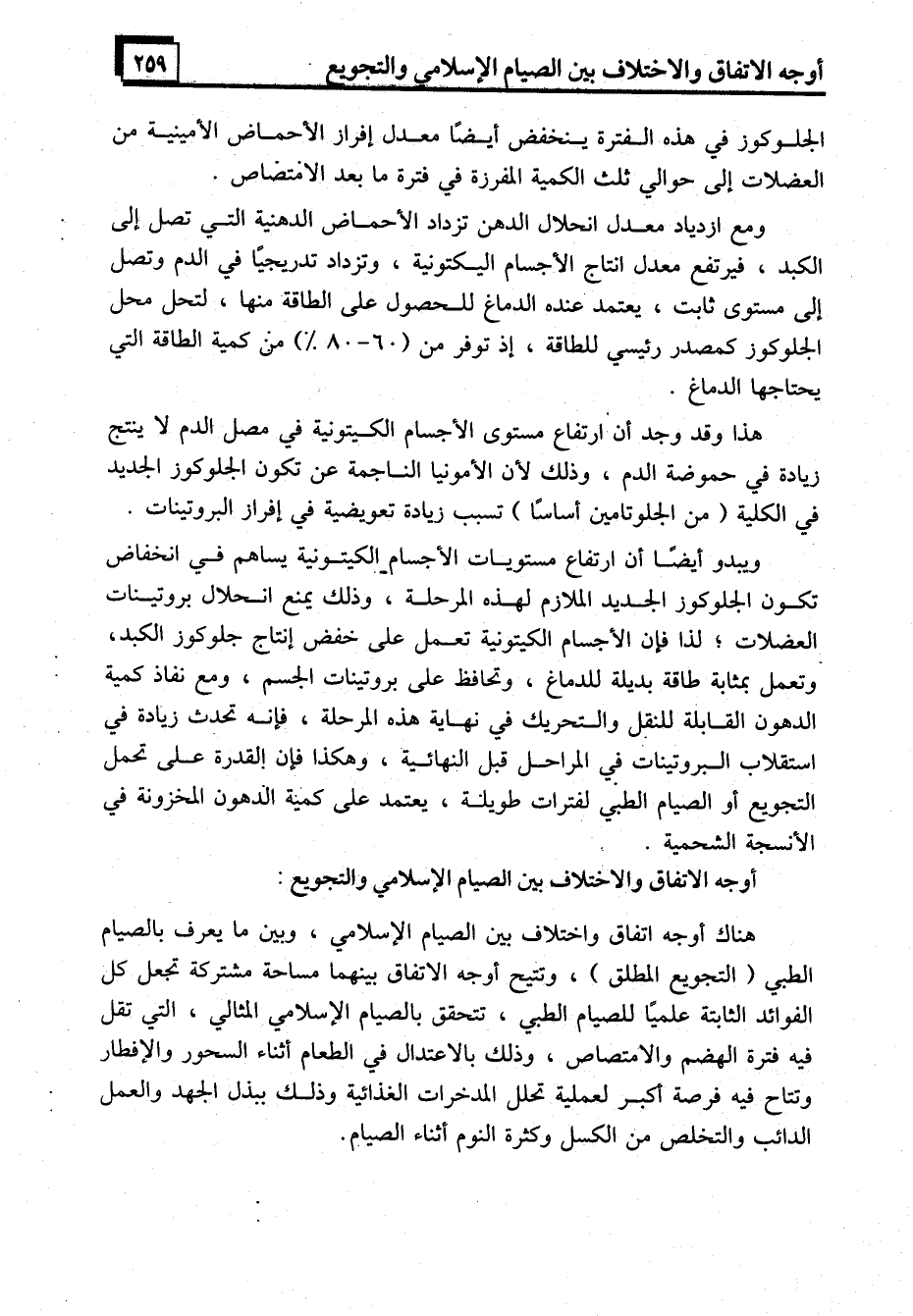 ويبدو أيضاً أن ارتفاع مستويات الأجسام الكيتونية يساهم في انخفاض تكون الجلوكوز الجديد الملازم لهذه المرحلة، وذلك يمنع انحلال بروتينات العضلات؛ لذا فإن الأجسام الكيتونية تعمل على خفض إنتاج جلوكوز الكبد، وتعمل بمثابة طاقة بديلة للدماغ، وتحافظ على بروتينات الجسم، ومع نفاذ كمية الدهون القابلة للنقل والتحريك في نهاية هذه المرحلة، فإنه تحدث زيادة في استقلاب البروتينات في المراحل قبل النهائية، وهكذا فإن القدرة على تحمل التجويع أو الصيام الطبي لفترات طويلة، يعتمد على كمية الدهون المخزونة في الأنسجة الشحمية.